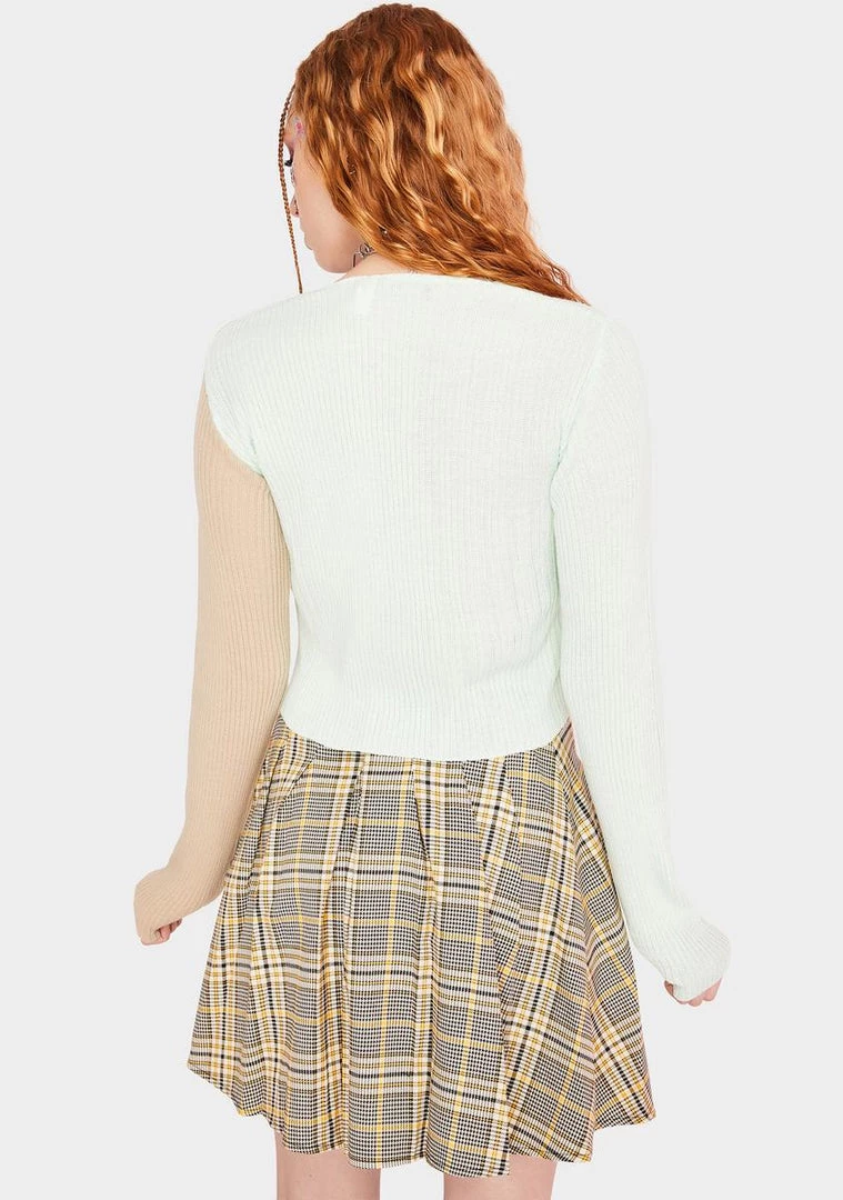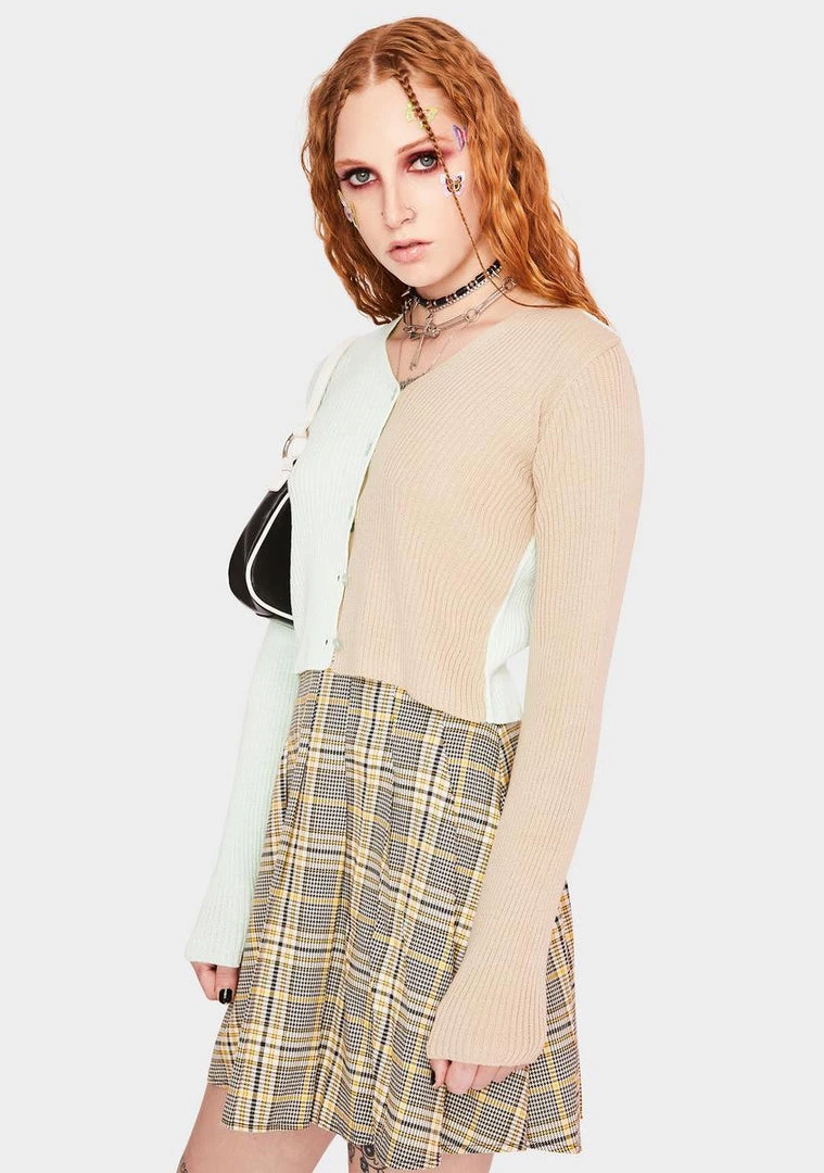 for rolling with the homies! This 90รขยยs inspired cardigan features a split color knit construction, a cropped fit, and a button down front.