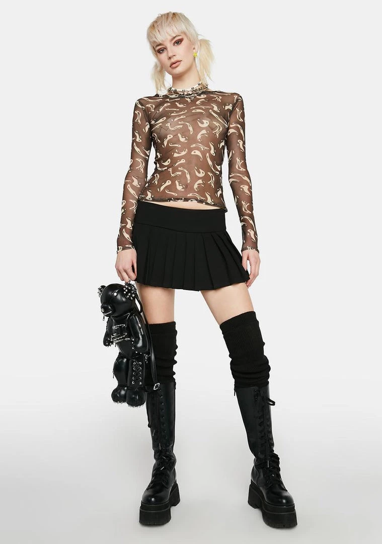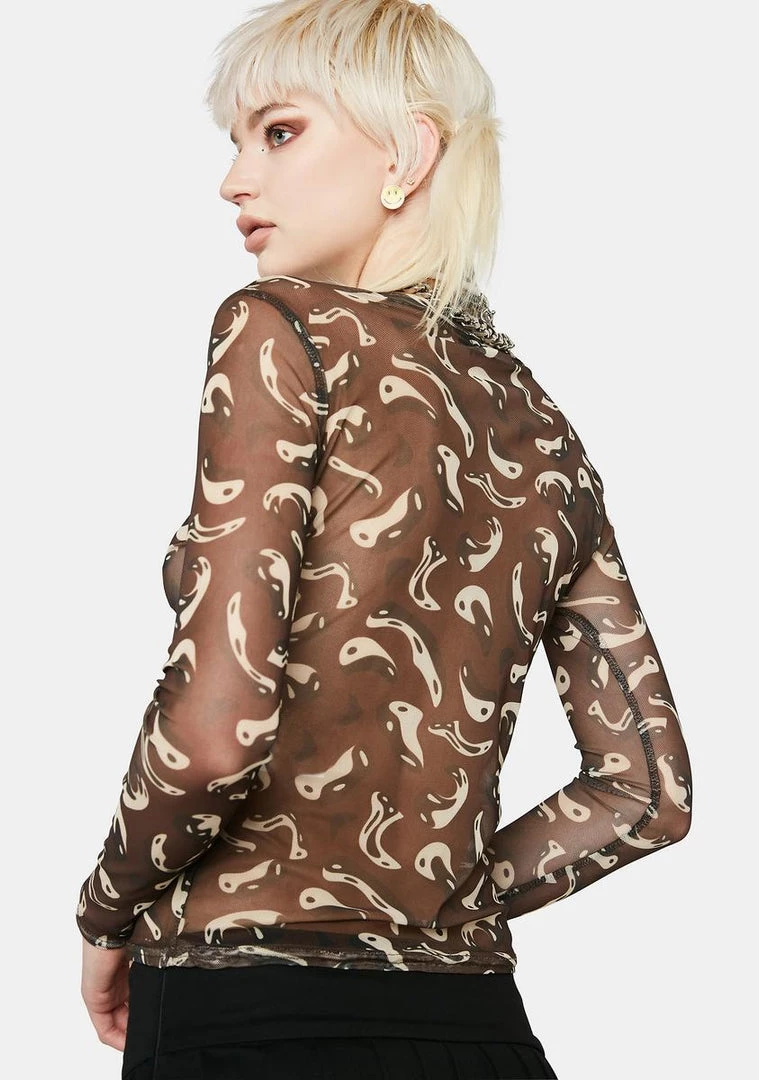 has a sheer mesh construction, long sleeves, a crop top fit, and a melting yin yang print all over.