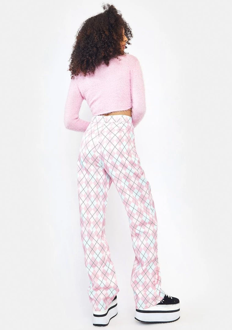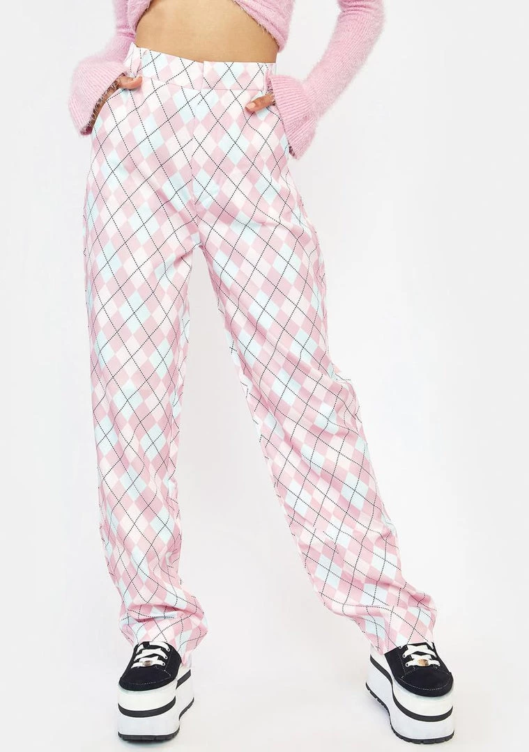 feature a high rise waistline with belt loops, a wide leg relaxed fit, and an argyle pattern all over.
