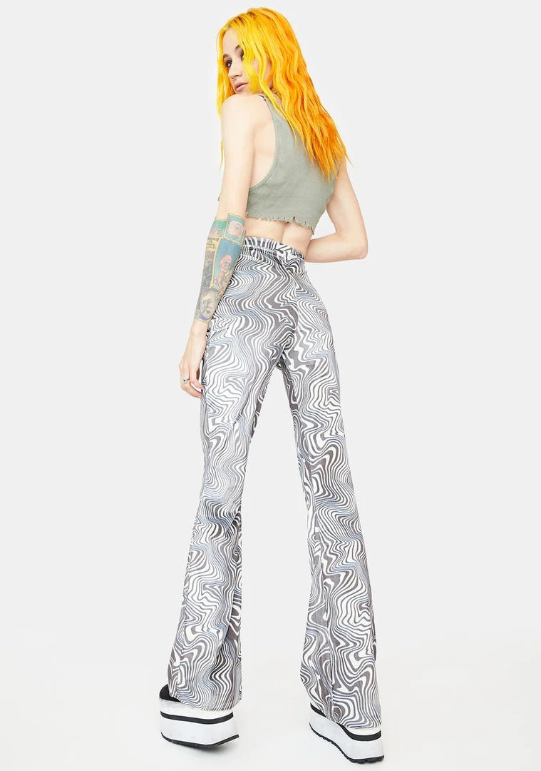 get groovy with me. These pants have a high rise waistline, a flare leg fit, and a wavy pattern all over.