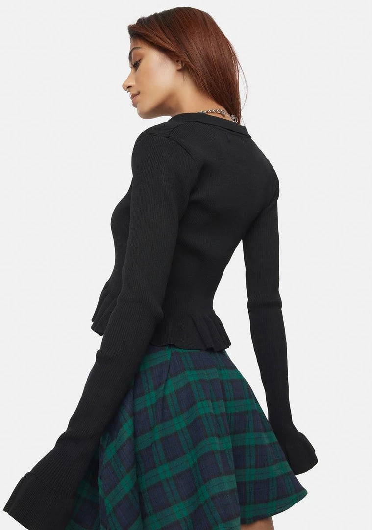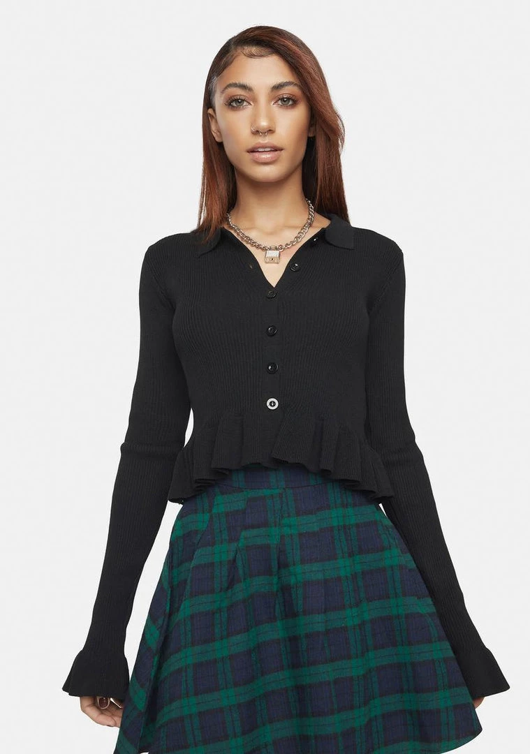 you’ve got a pep in your step. This cardigan has a ribbed construction, long bells sleeves, ruffle trim, and front button closures.