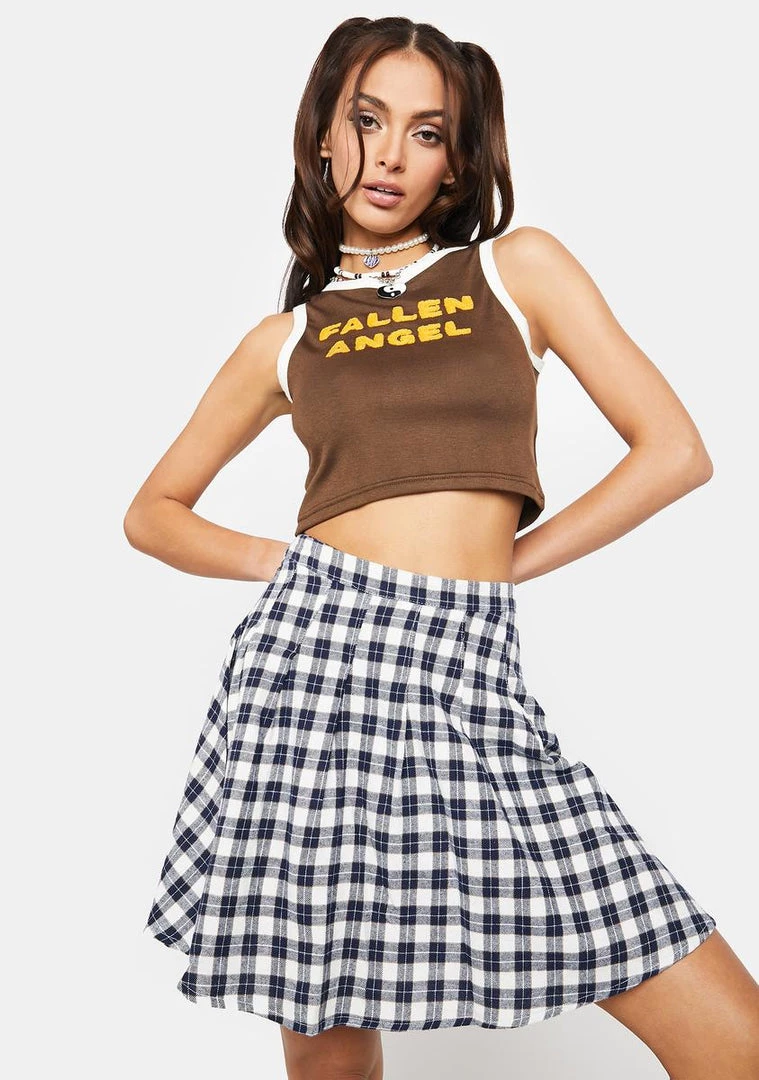 has an A-line silhouette, a high waist fit, a pleated construction, and a check pattern all over.