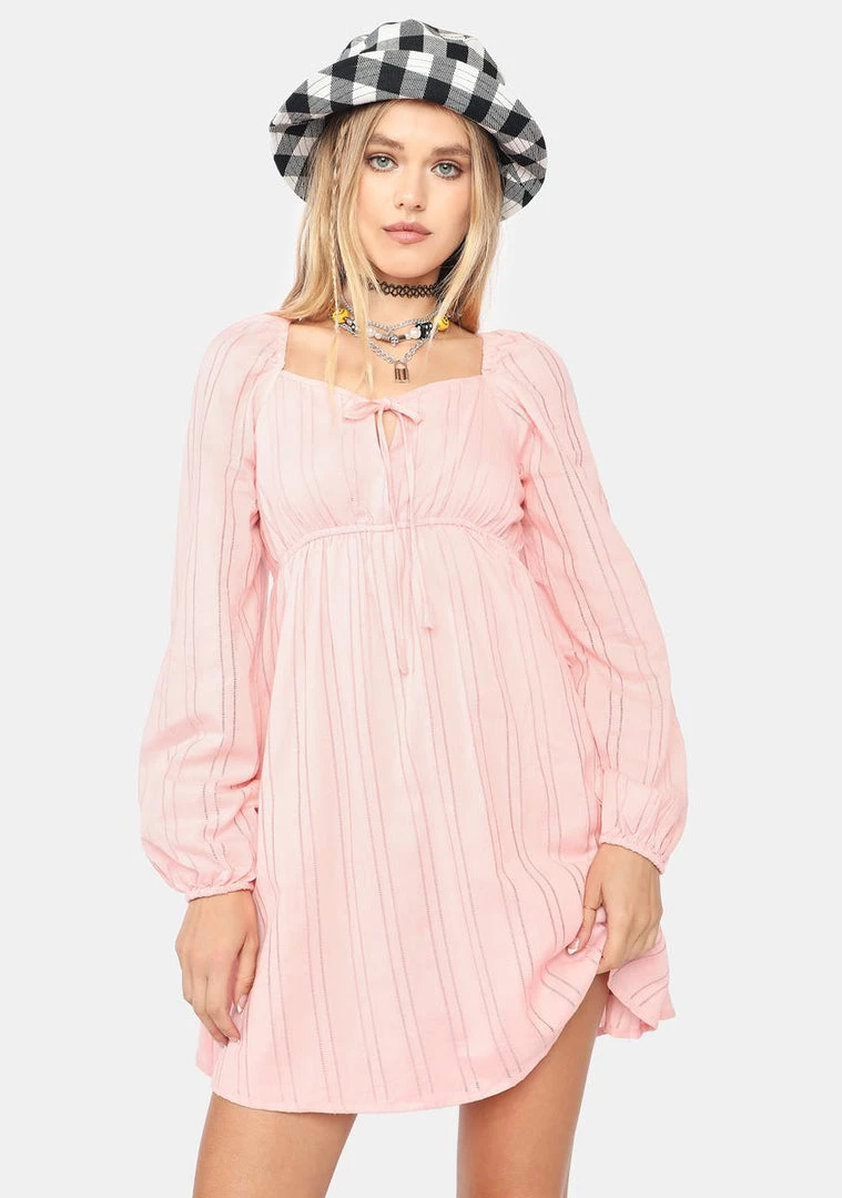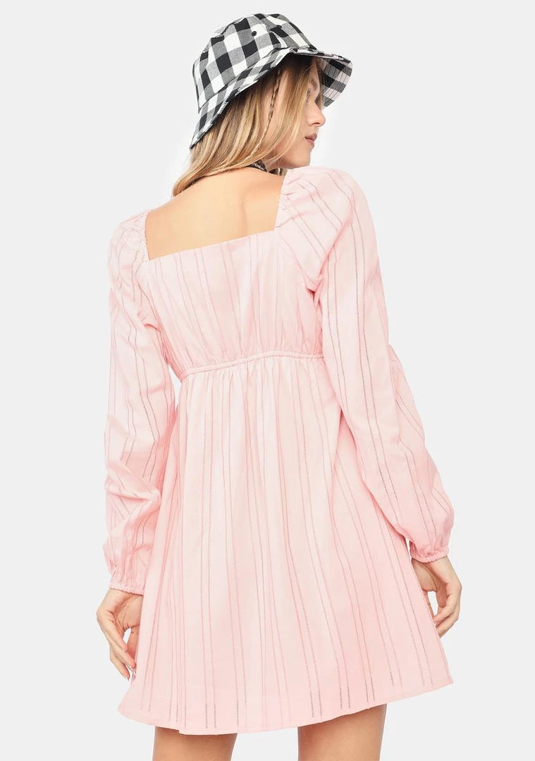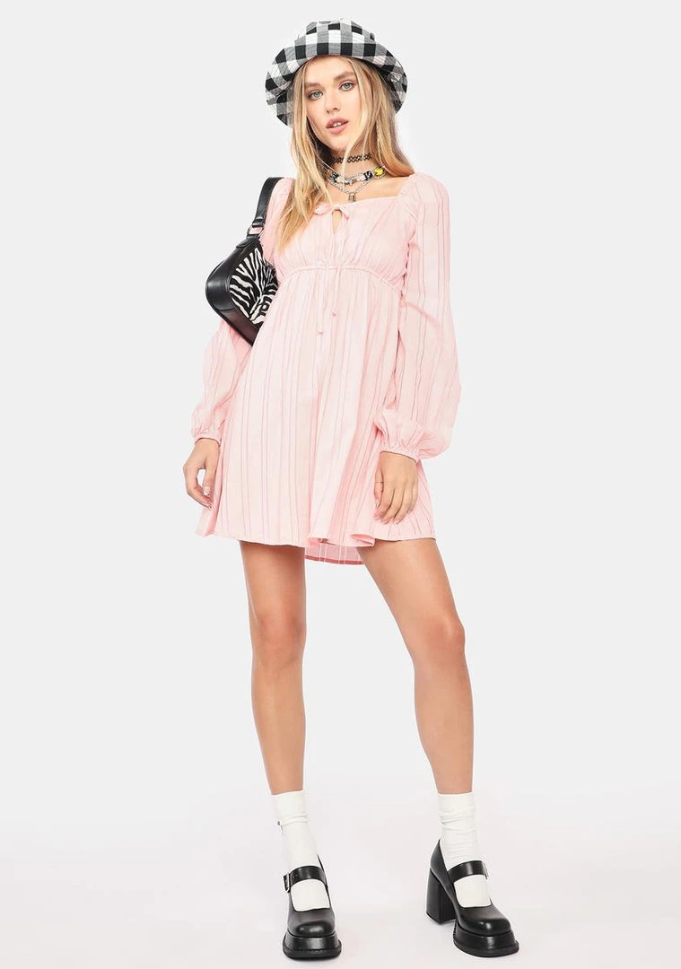 features a sweetheart neckline with a bow detail, long puff sleeves, a cinched waist, and a vertical striped design.