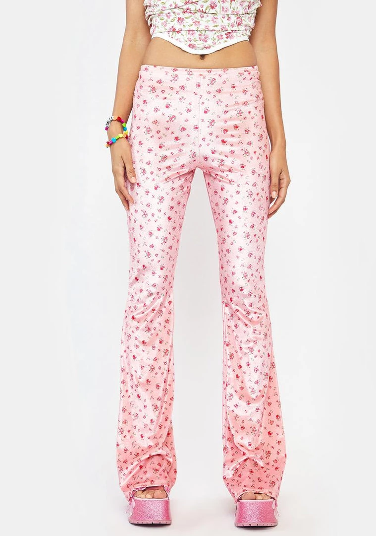features a soft velvet construction, an all over vintage floral print, an elastic waistband, and a flare leg silhouette.