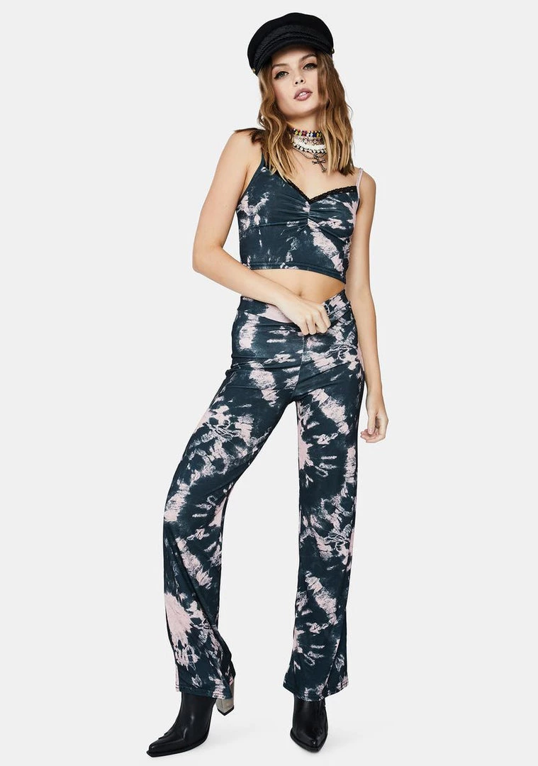 you turn up the heat in these streets. These tie dye patterned pants have a stretchy high waist fit and wide leg.