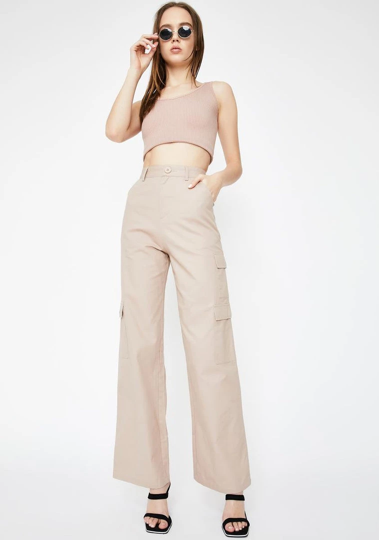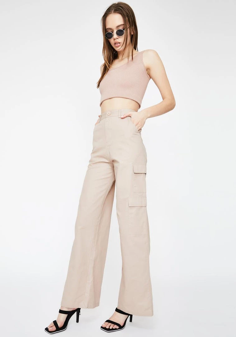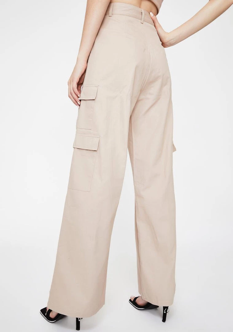 got ya leavin em in ur dust bb! Make it a photo finish while wearing these high waisted trouser pants with cargo pockets and a wide leg fit.