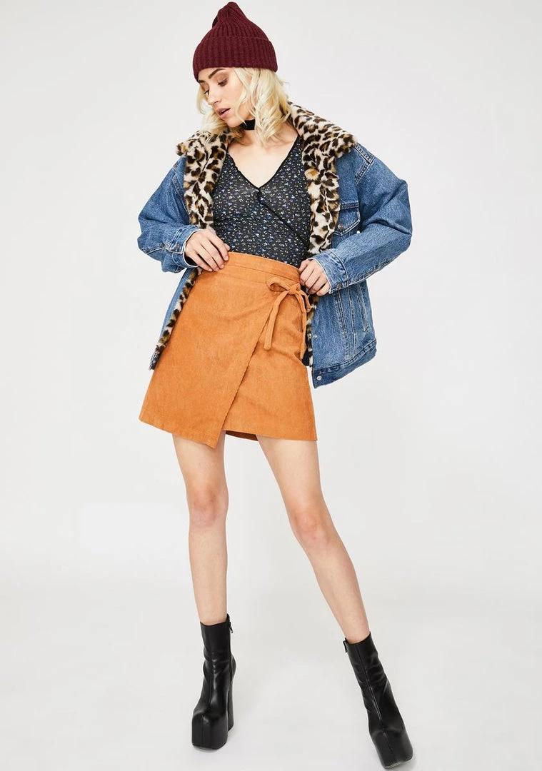 cuz itΓ’ΒΒs time for a hot girl thotumn, bb! Always stay looking cute at the next concert with your friends while wearing this front wrap mini skirt with a bow tie closure and a corduroy knit.