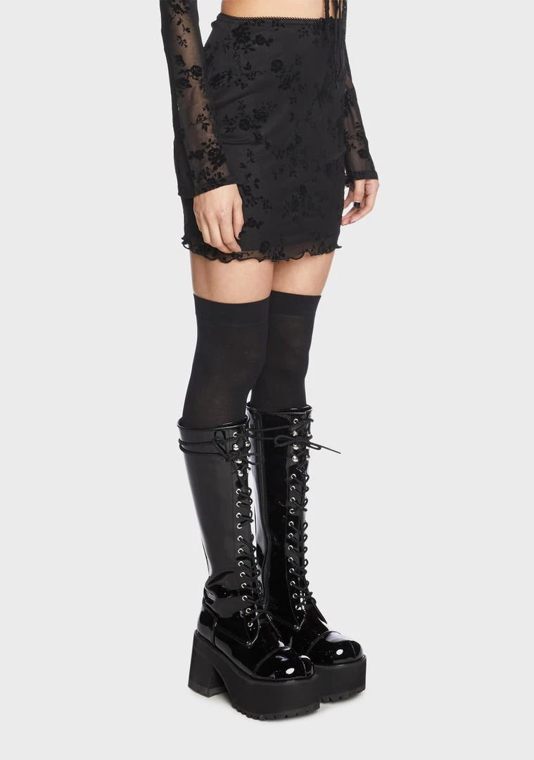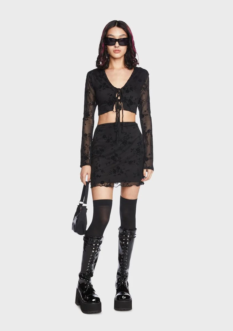 cuz you’re a street style star in the making. This high-waisted skirt has a flocked floral mesh construction, a bow applique at front, and lettuce edge trim.