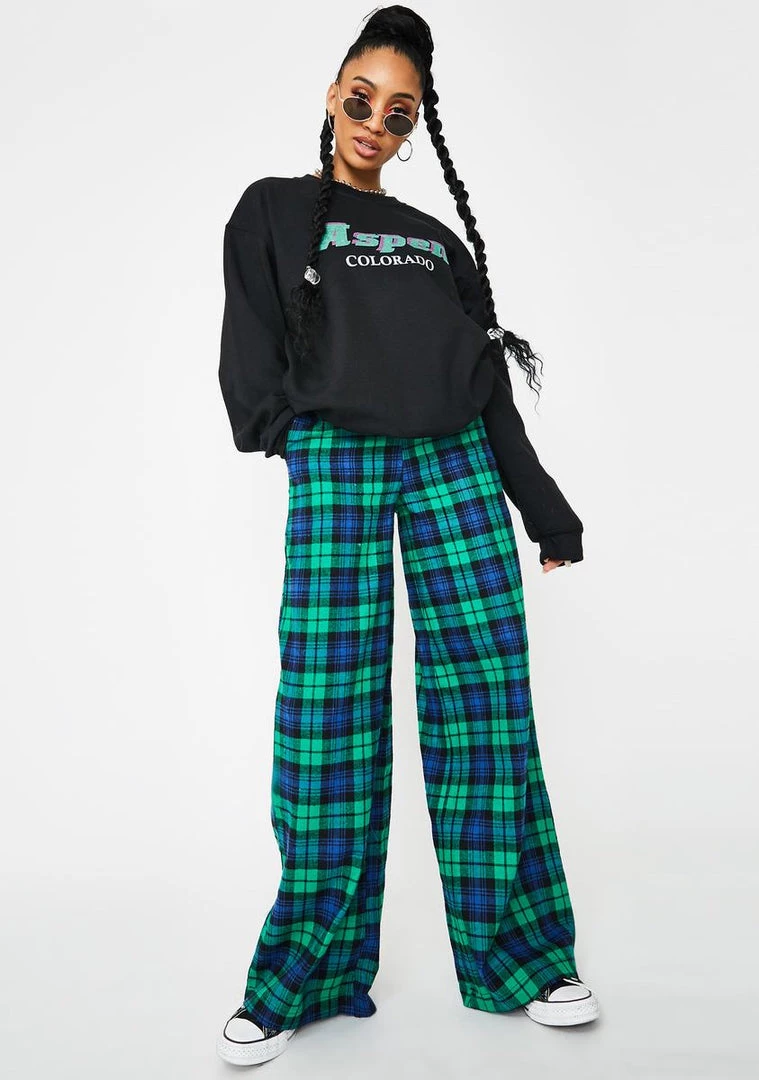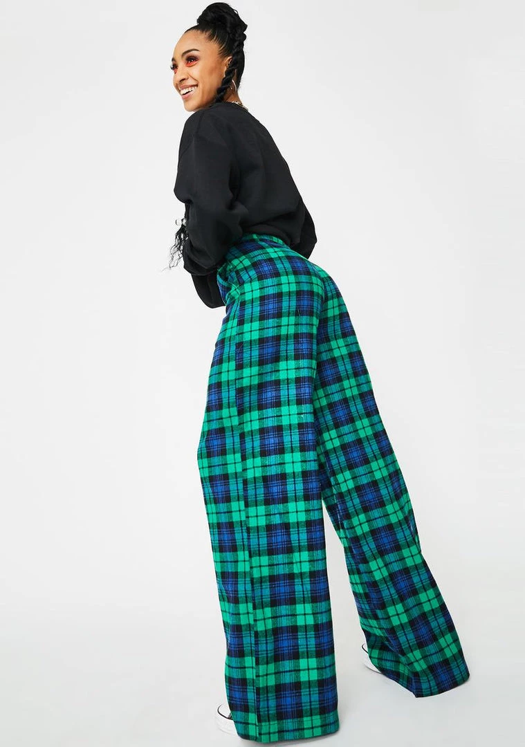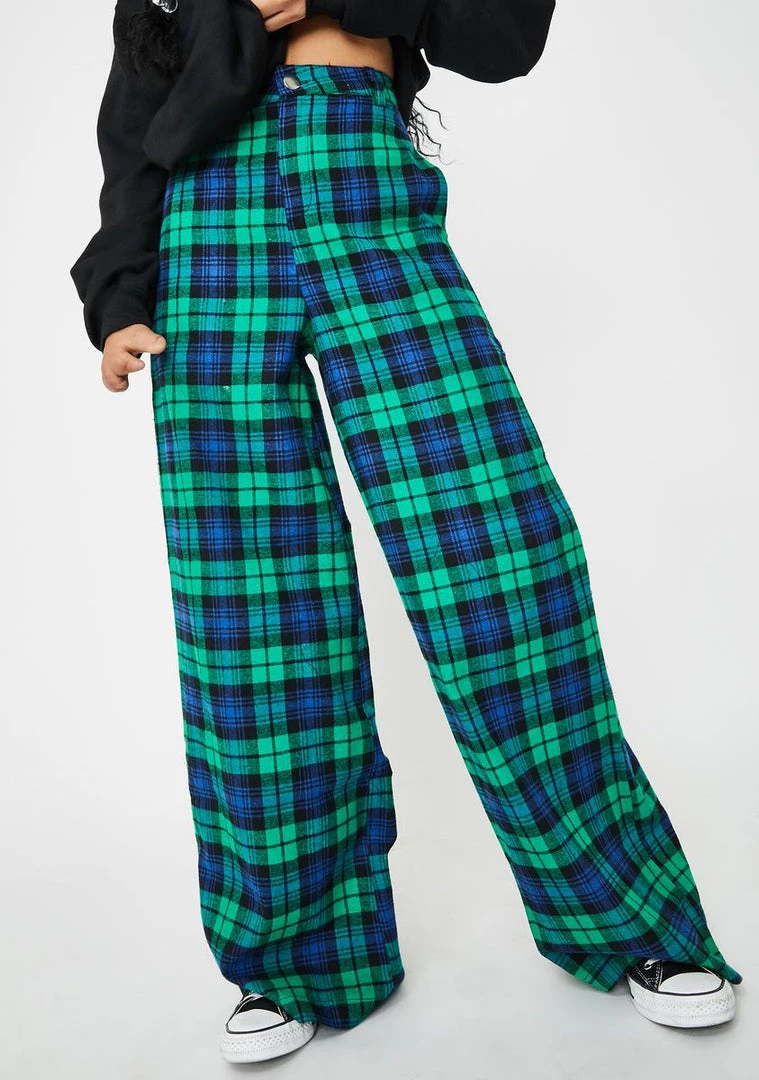 catch ya on the flip side! Ditch your comfort zone in these rad trousers that have dope plaid construction, xxxtra wide legs, a high waisted fit, and a buttoned zip closure.