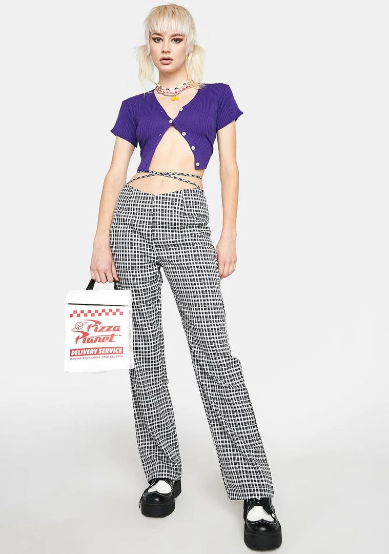 have adjustable tie closures, a high rise fit, and a gingham print all over.