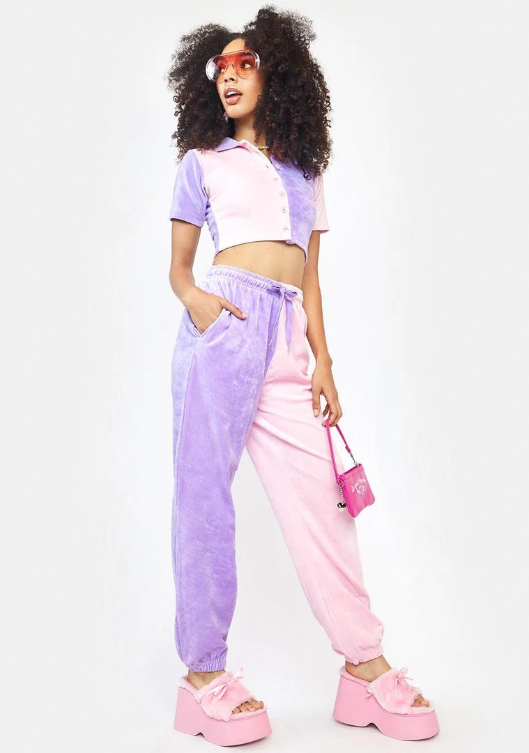 have a soft velour construction, a drawstring waistband, a split color block design, and elasticized ankle cuffs.