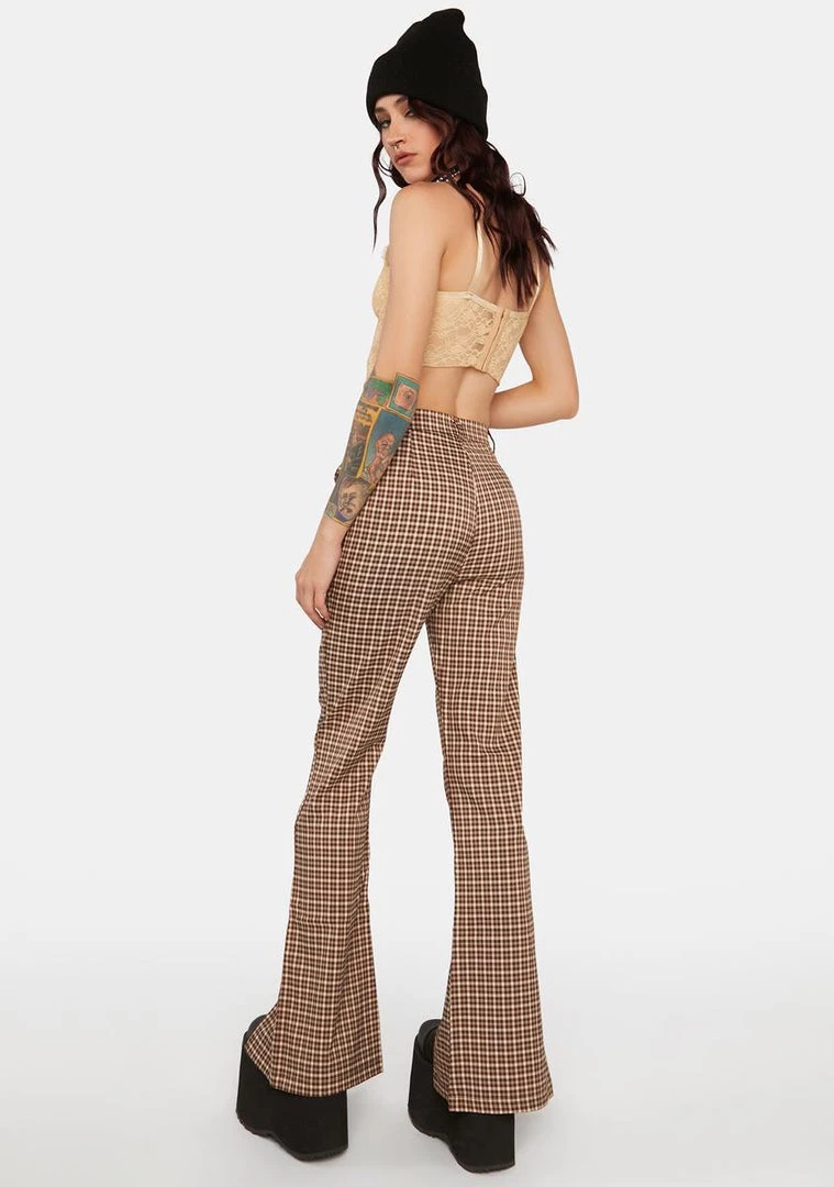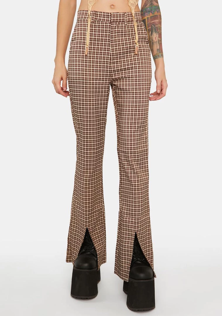 cuz you dress however you please. These high-waisted pants have a classic plaid print all over, slightly-flared legs with a split hem, belt loops, side pockets, and pleated details at back.