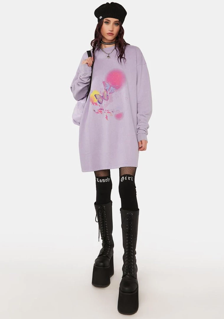 cuz it’s gonna be a good day. This sweater dress has butterfly and fish motifs printed at front, an oversized fit, and dropped shoulders.