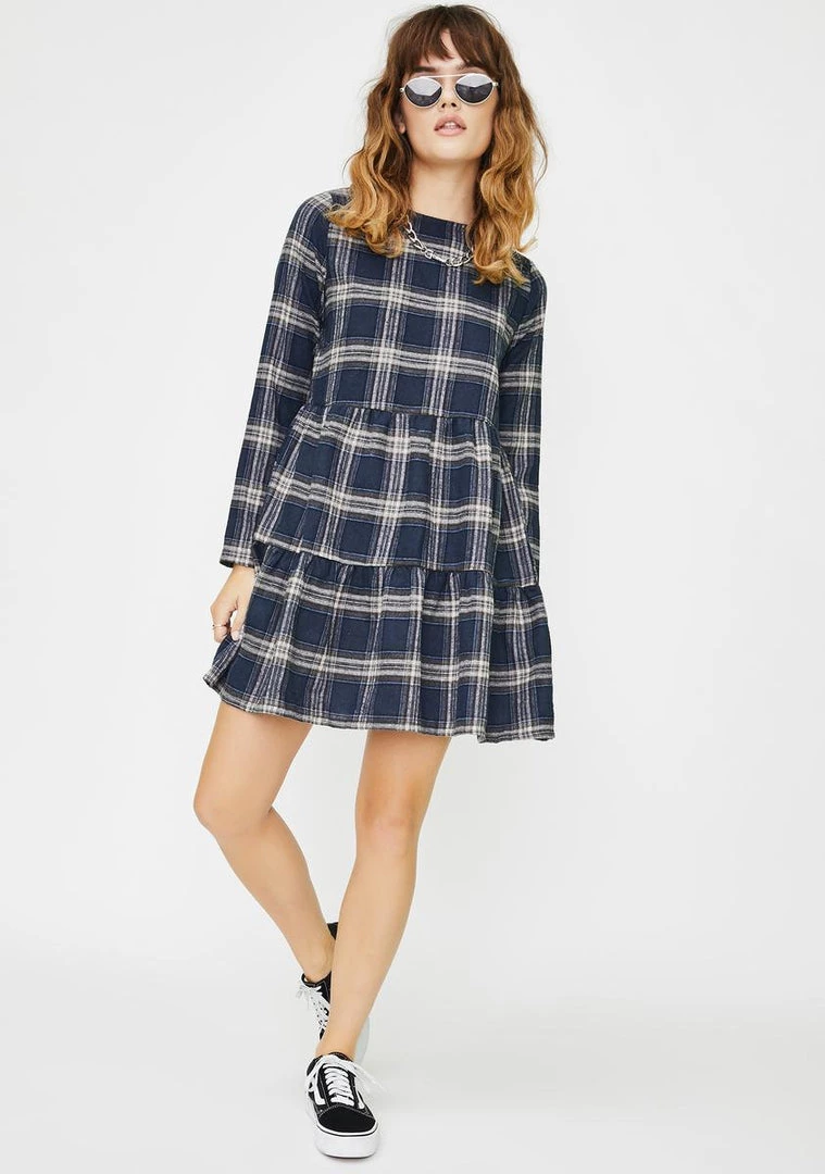 raise a lil hell, babe. Look dope AF in this long sleeve mini dress that has a plaid pattern all ova, rounded neckline Nรขยย babydoll fit.