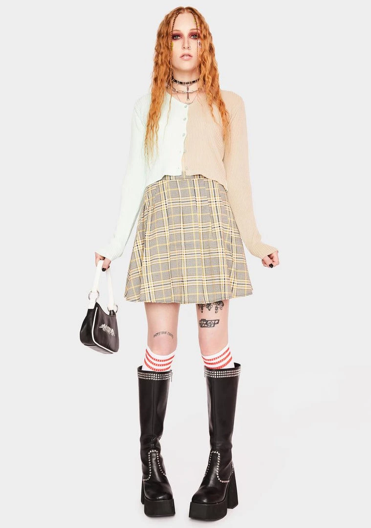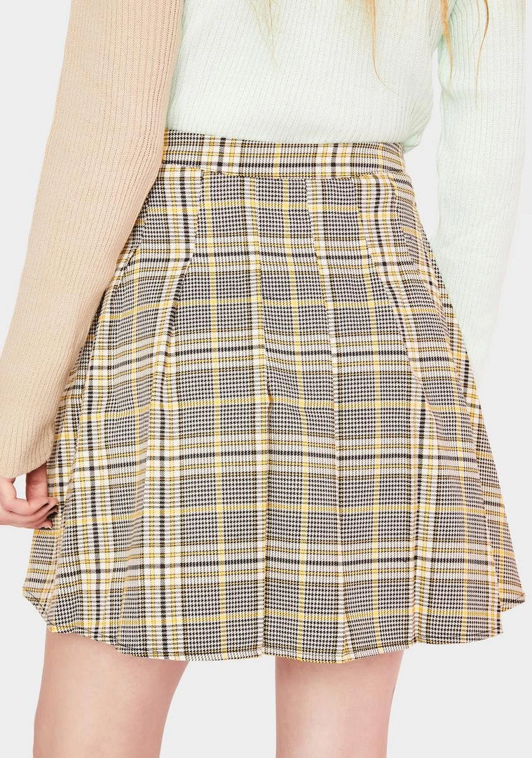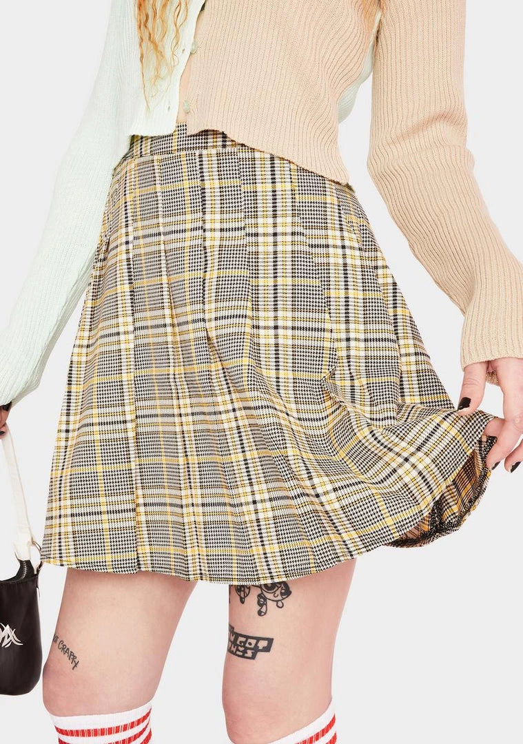 gotcha breaking all the schoolyard rules! This high waist mini skirt has a checkered tartan print all over, pleated accents, and a fit & flare silhouette.