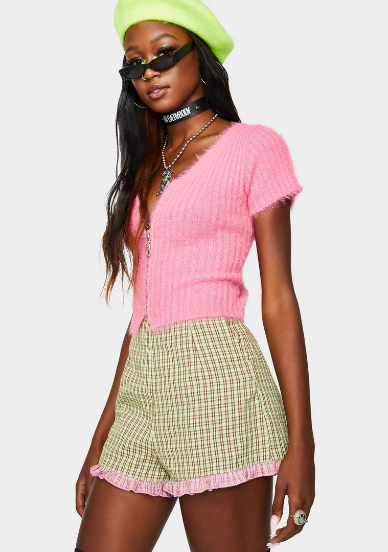 cuz ladies donΓ’ΒΒt start fights, but they can finish them! These posh high waist shorts have a light checkered construction, contrast ruffle trim, and a front slant pockets.