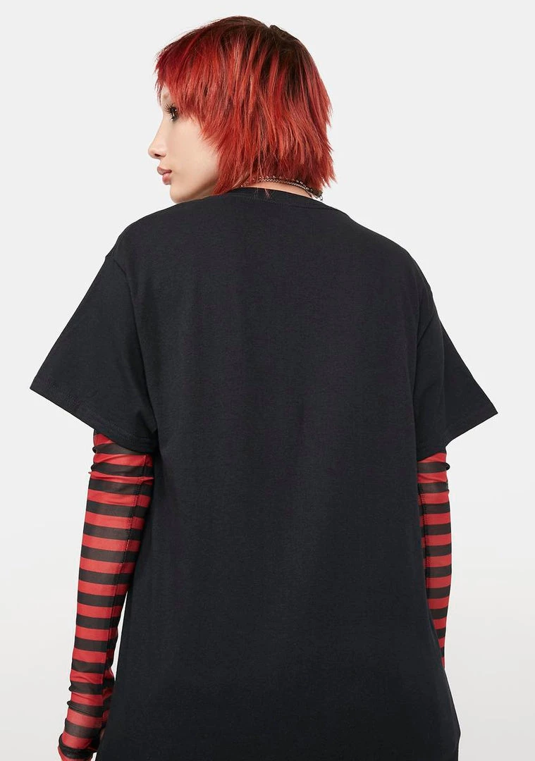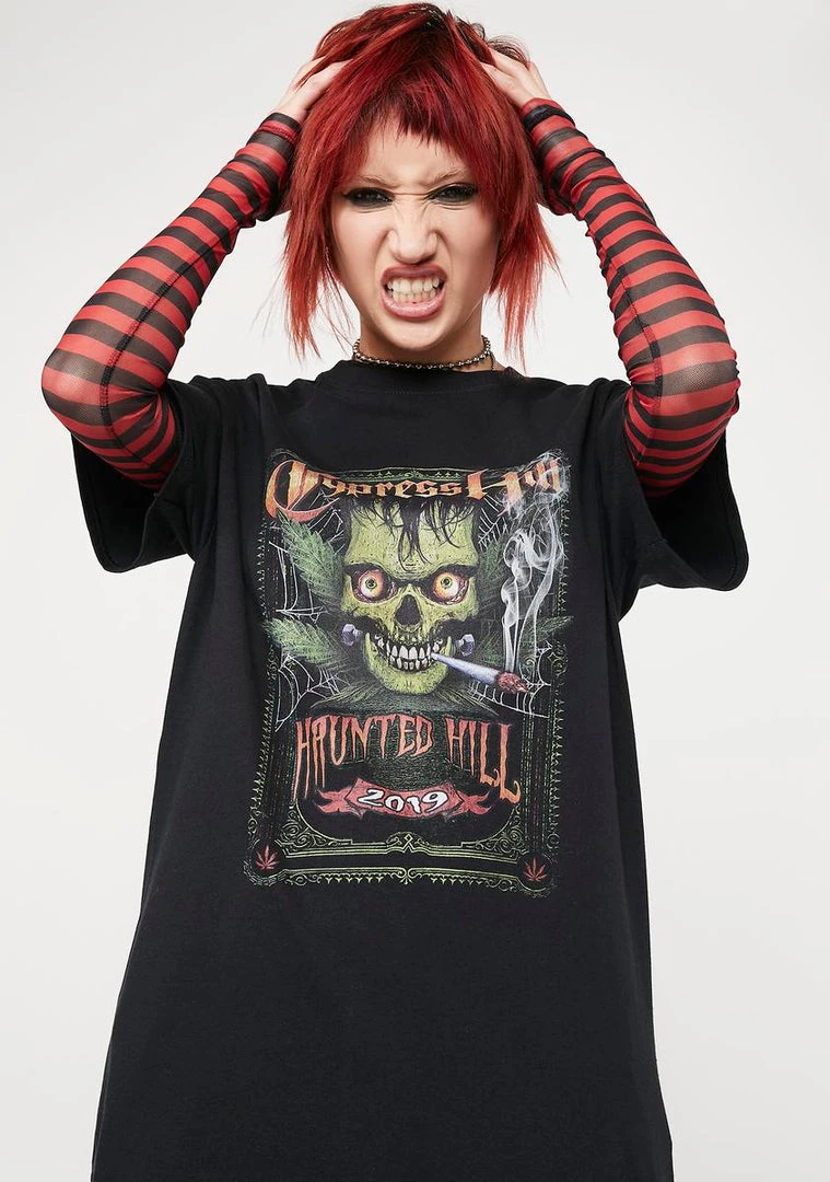 has a spooky stone graphic across the front, an oversized fit, a ribbed crew neckline, and short sleeves.