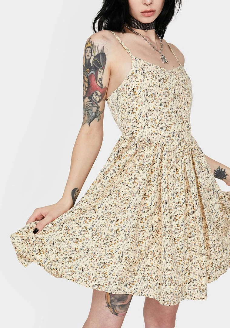 for when you want to stop and smell the flowers! This flirty skater dress has adjustable cami straps, a low scoop neckline, and an all-over floral print.
