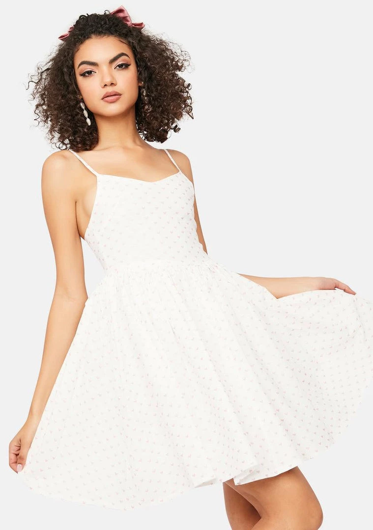 has adjustable shoulder straps, a flared skirt, and a heart print all over.
