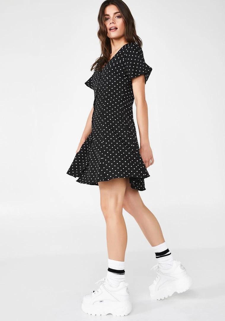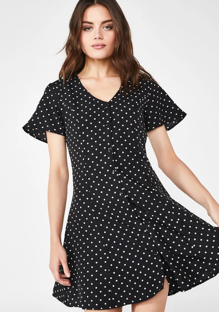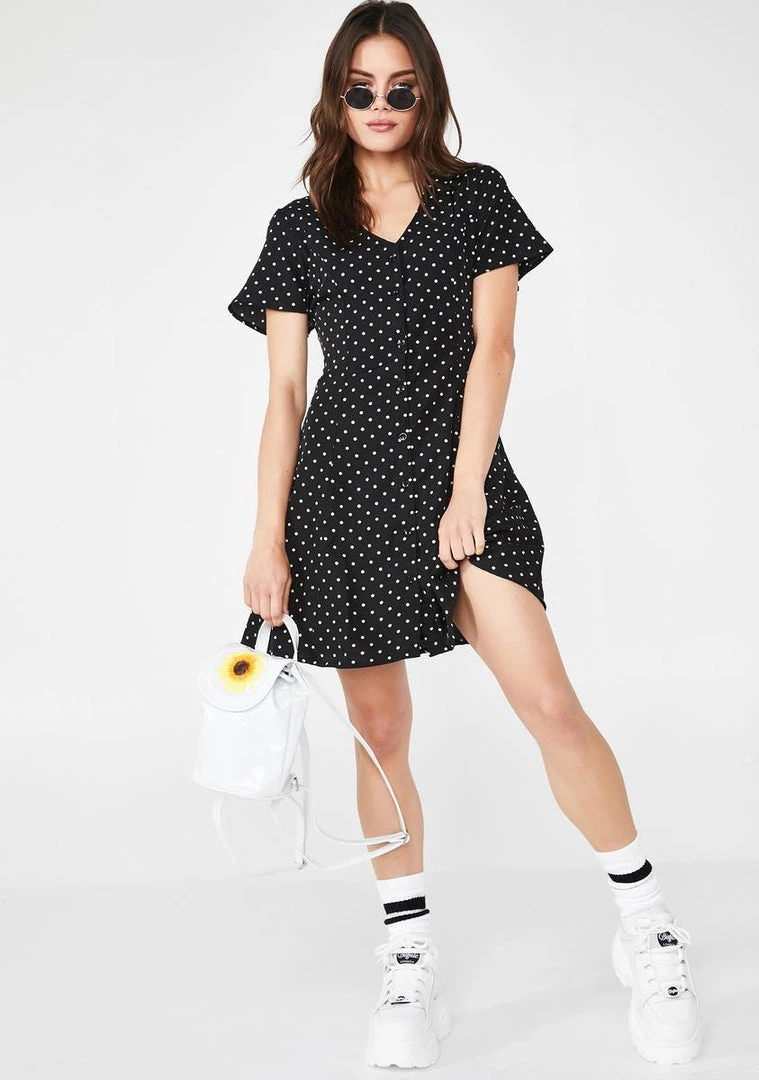 cuz youΓ’ΒΒre lookinΓ’ΒΒ like a whole sweetheart bb! Break hearts in this polka dot skater dress that has a v-neck, short sleeves, NΓ’ΒΒ front button closures.