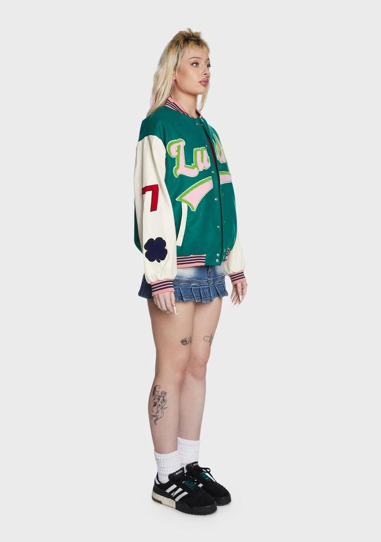 cuz yay for the home team! This varsity jacket has long sleeves, a striped trim, side pockets, “Lucky” embroidered on the front, applique detailing of clovers, an ace, a cherry, and a seven embroidered on the sleeves, a flaming dice applique on the back, front snap button closures, and an oversized fit.