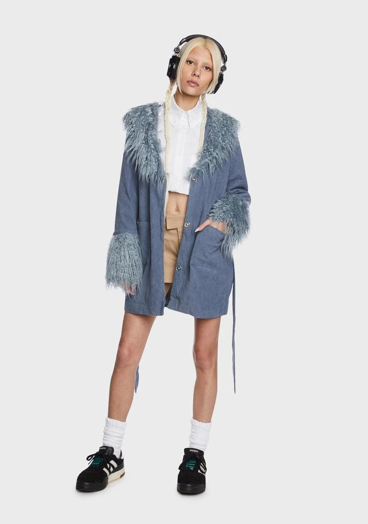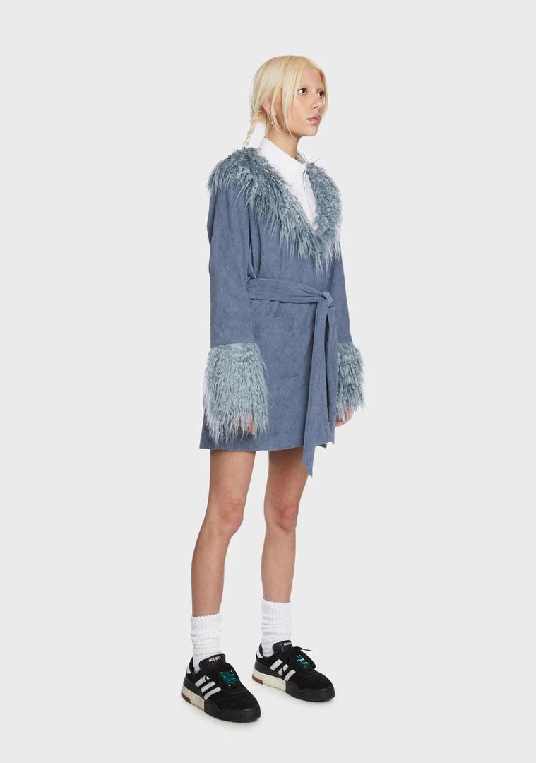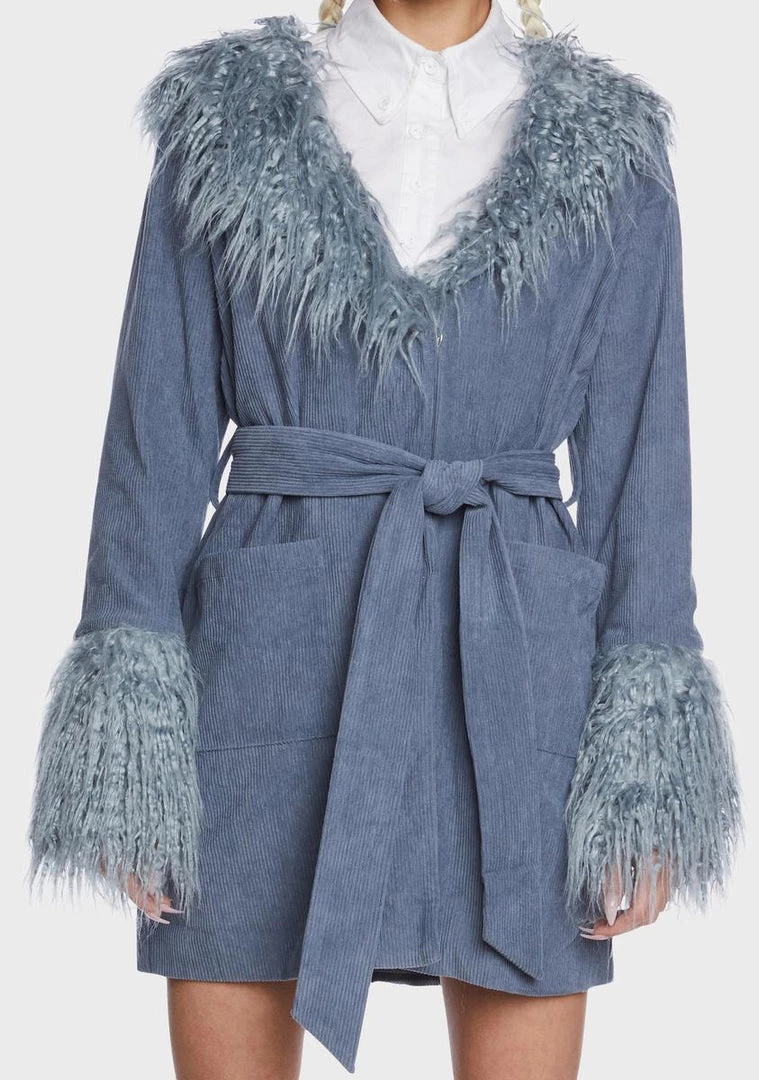 cuz make a statement. This coat has a corduroy construction, a shaggy faux fur trim, long sleeves, front pockets, and an adjustable waist tie closure.