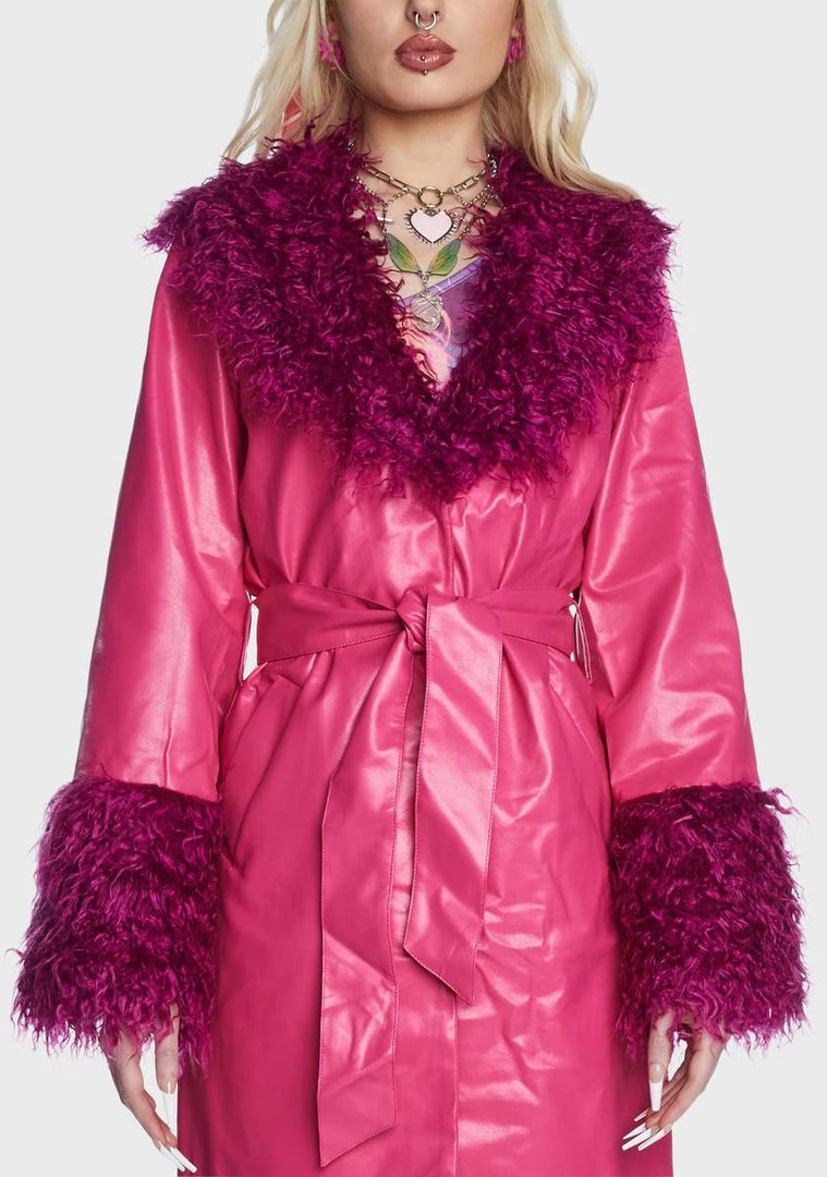 cuz you’re glam 24/7! This coat has a vegan leather construction, a shaggy faux fur trim, long sleeves, a notched lapel collar, side pockets, and front tie closures.