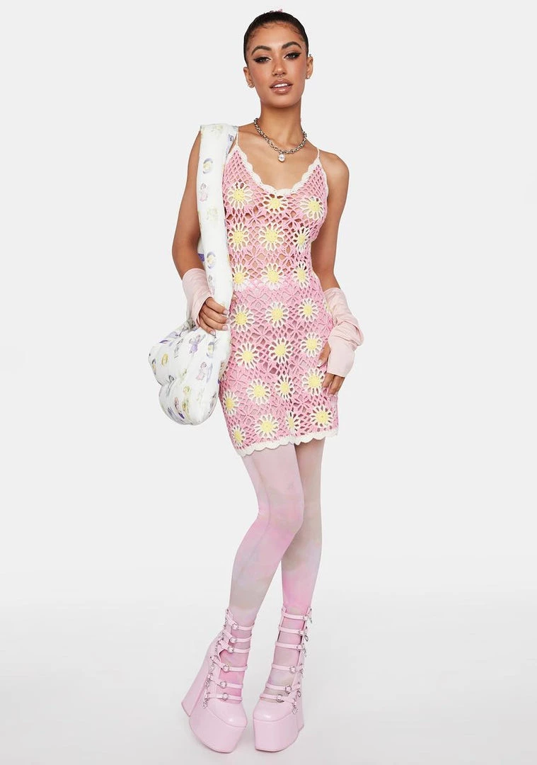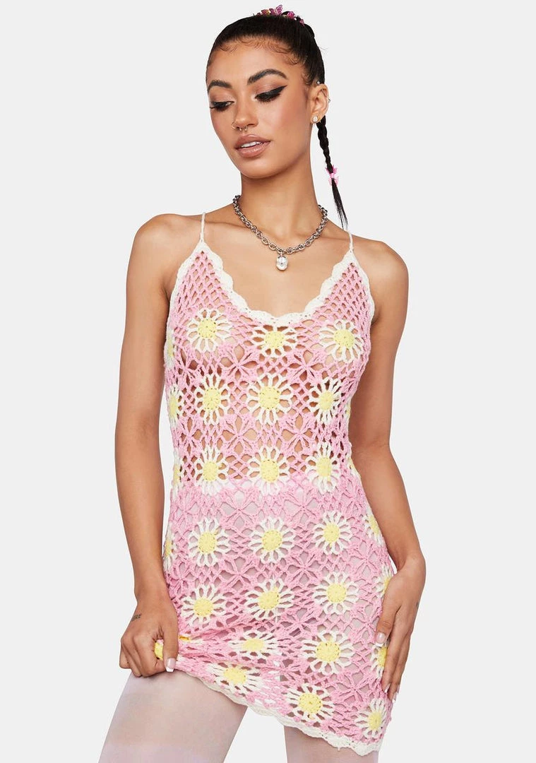 got you feelin’ happy and free. This mini dress features a sheer crocheted fabrication with floral details, a low-cut back, crisscross lace-up ties at back, and scalloped trim.