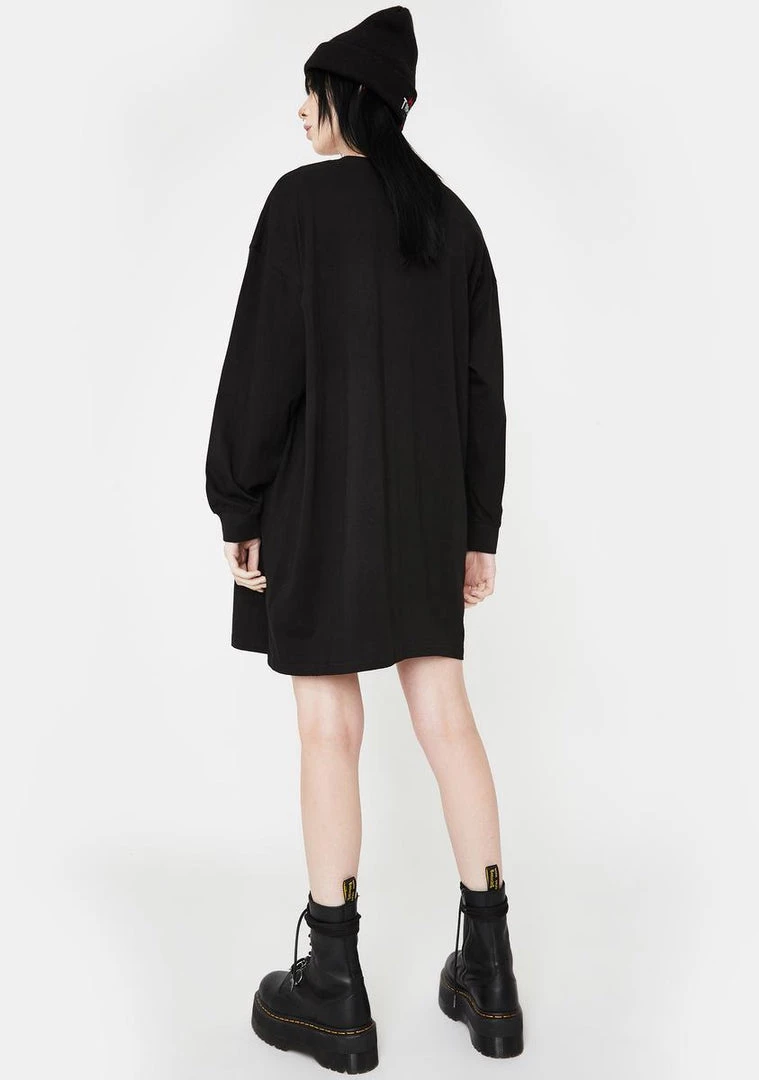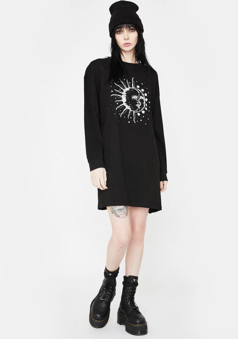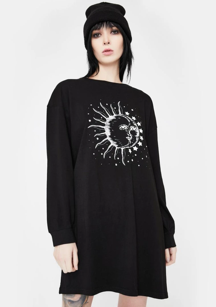 got yer head up in the clouds, hun! Stay one with the stars in this rad long sleeve shirt dress that has supa cosmic graphics on the front, a wide neckline and relaxed fit.