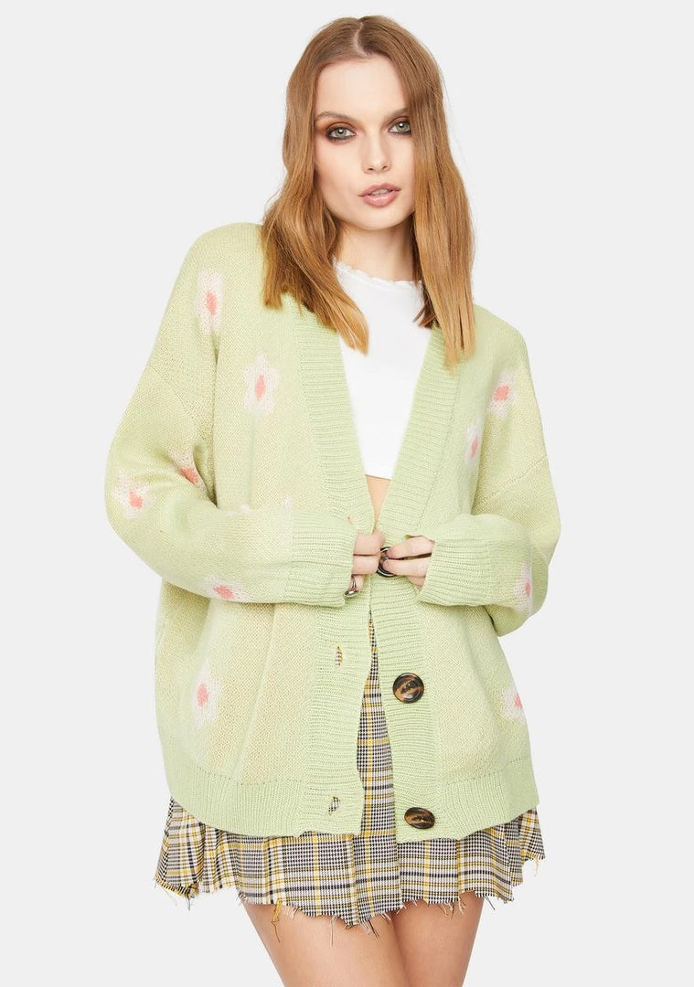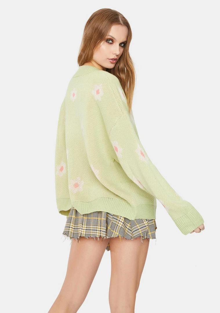 cuz you like to keep it simple. This knitted cardigan has a daisy print with a button closure.