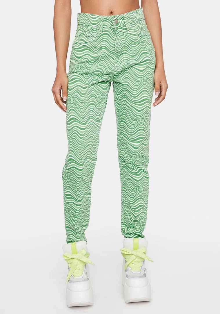spice up your life! These mom jeans have a high-waisted fit, a wavy print all over, and a zip fly closure.