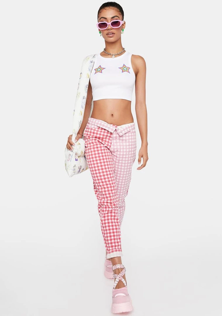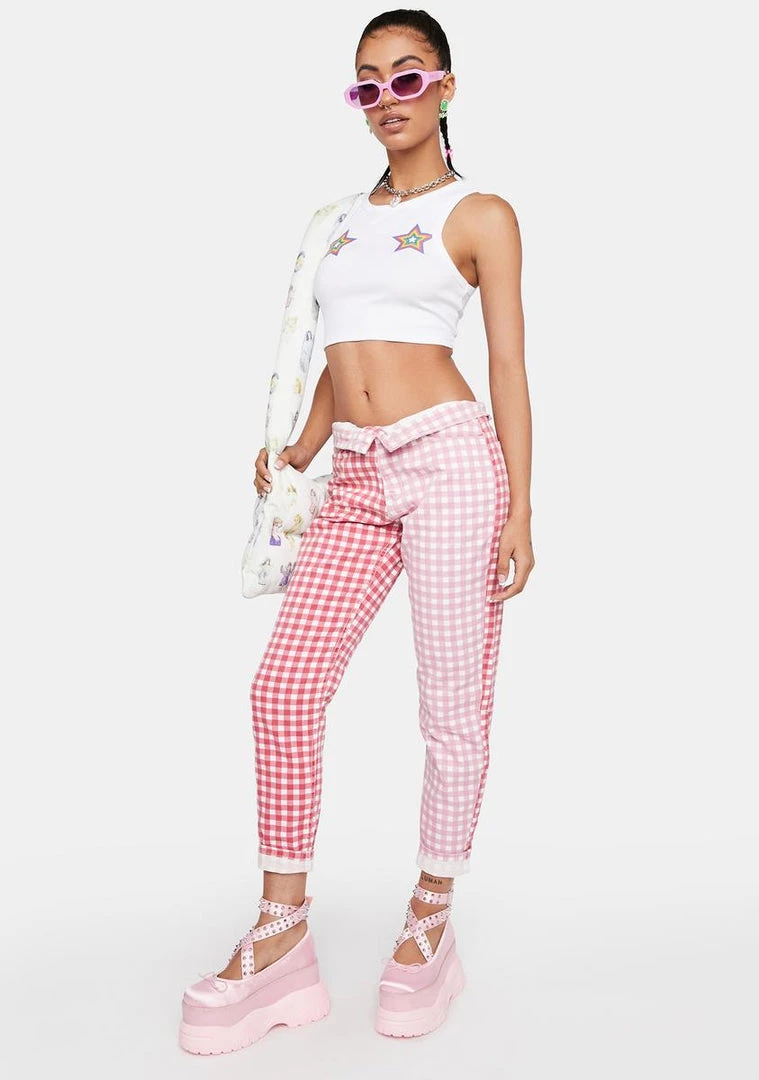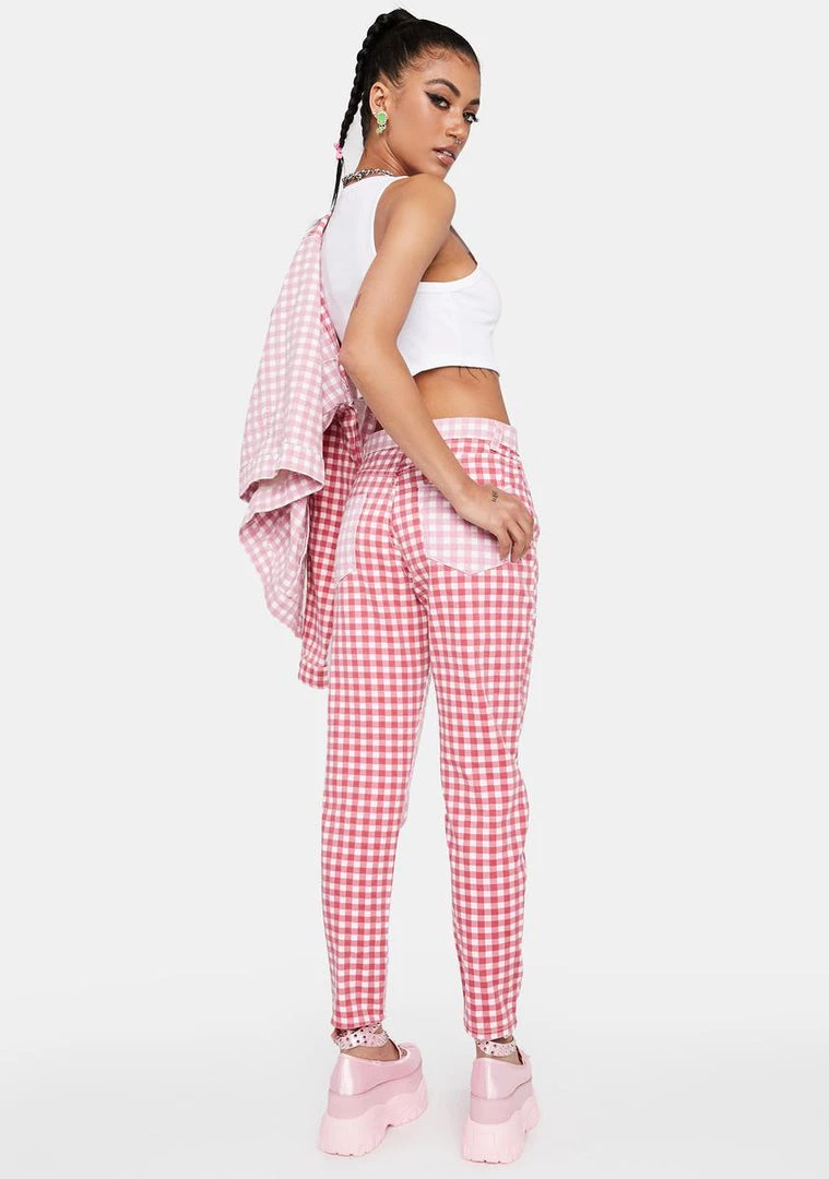 cuz you got sunshine on your mind. These high-waisted jeans feature a red and pink color blocked gingham print, front and back pockets, a zip-and-button closure at front.