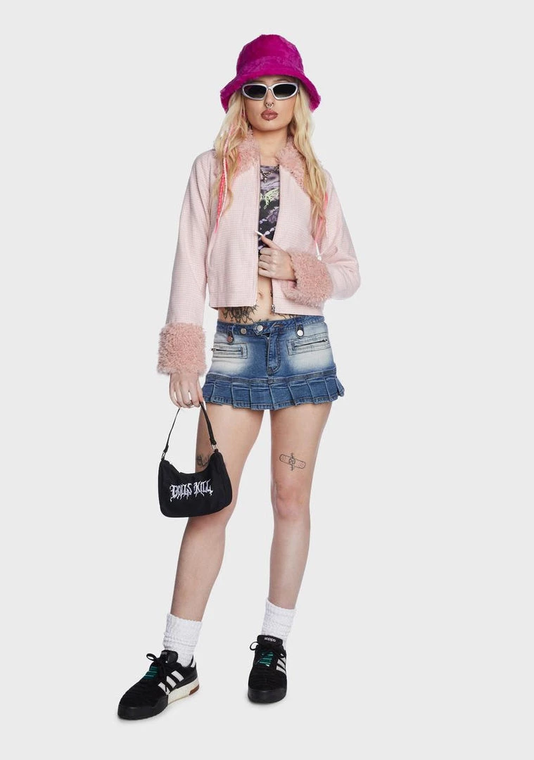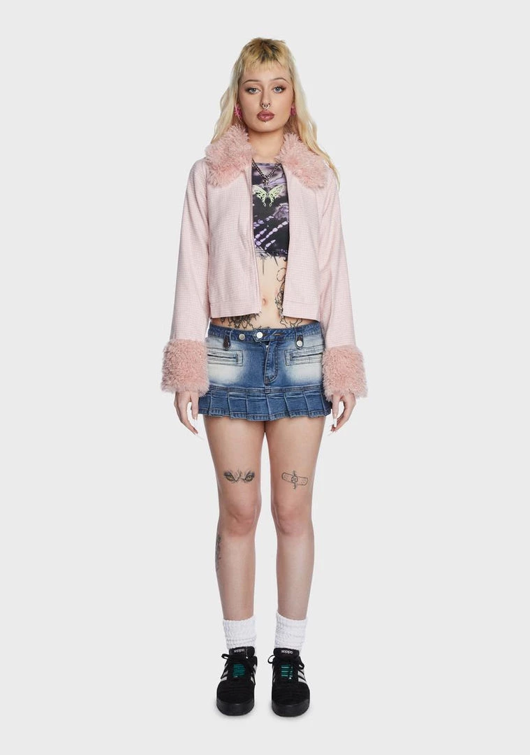 cuz YOLO. This jacket has an all over houndstooth pattern, a faux fur collared trim and cuffs, side pockets, and a front zipper closure.