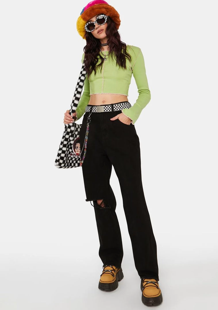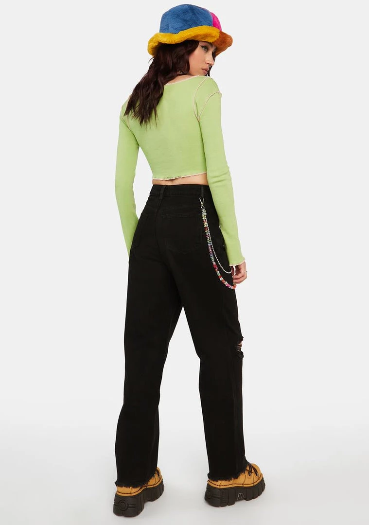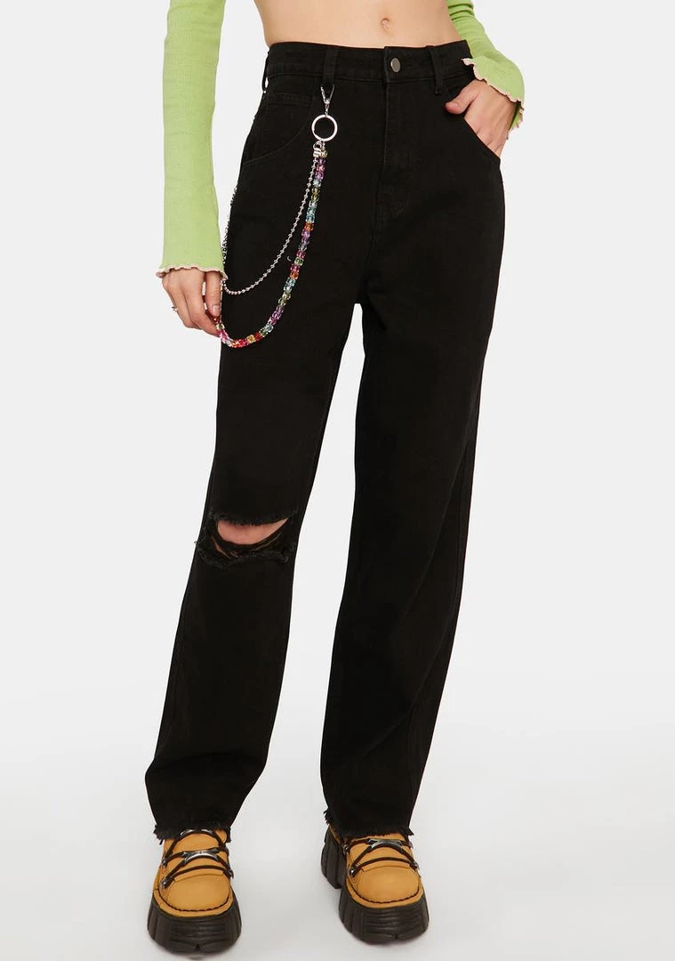 cuz you’ll never give up. These high-waisted jeans have beaded and ball chains at the right leg with a removable carabiner clip closure, classic 5-pocket styling, and a slashed cutout at the knee.