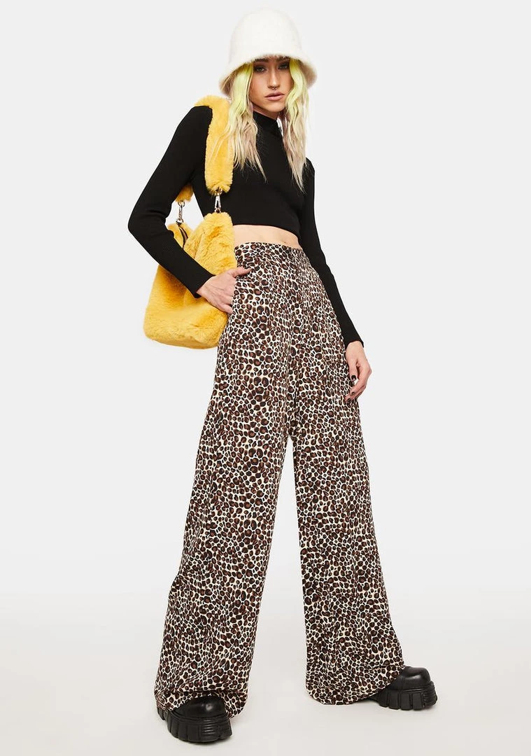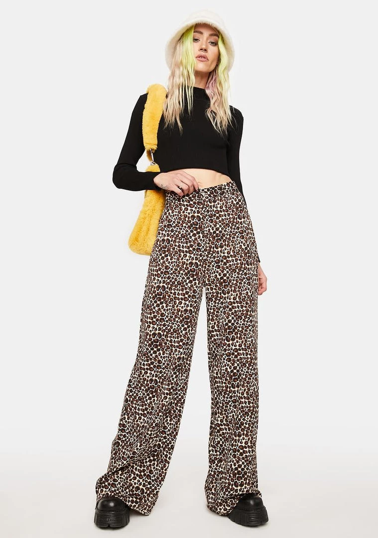 have a high rise waistline, a longline wide leg fit, a leopard print, and a trouser design.