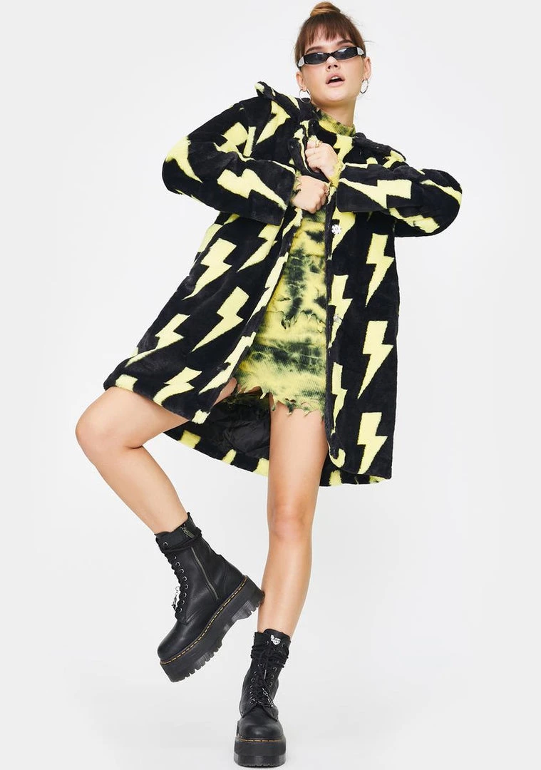 will leave ’em paralyzed in their trackz! This ultra soft faux fur coat has pockets on the sides, front button closures, and a lightning print all ova.