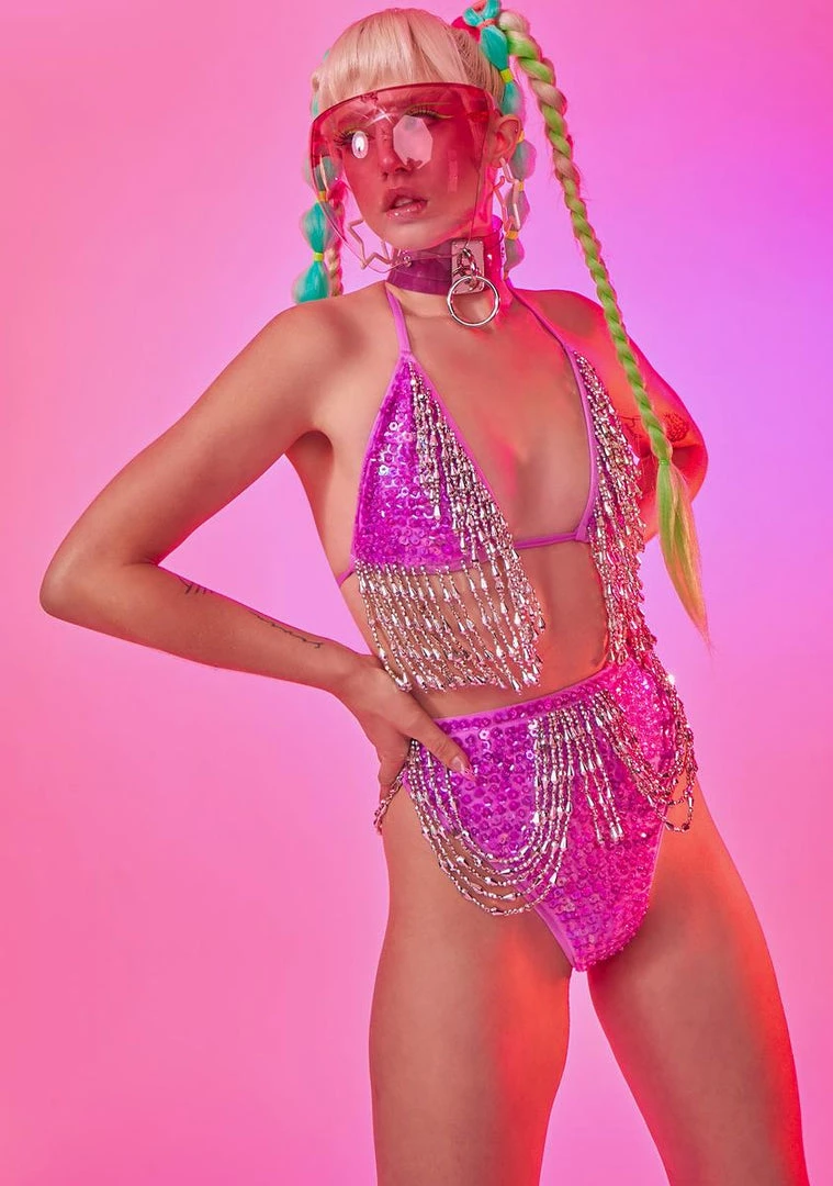 cuz youΓ’ΒΒre always ready to shake it! This handmade two-piece sequin set has beaded fringe trim, a triangle bra top, and matching high waist bottoms.