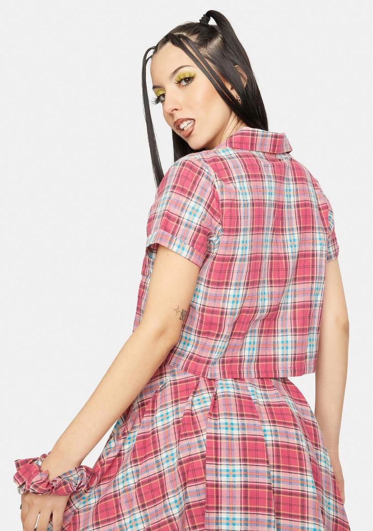 includes a plaid printed crop top with a collared neckline, button closures, and two breast pockets, and comes with a matching scrunchie.