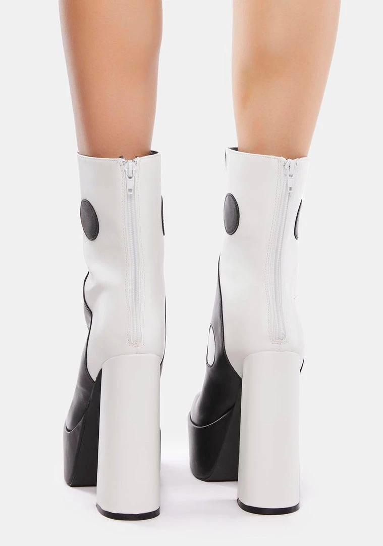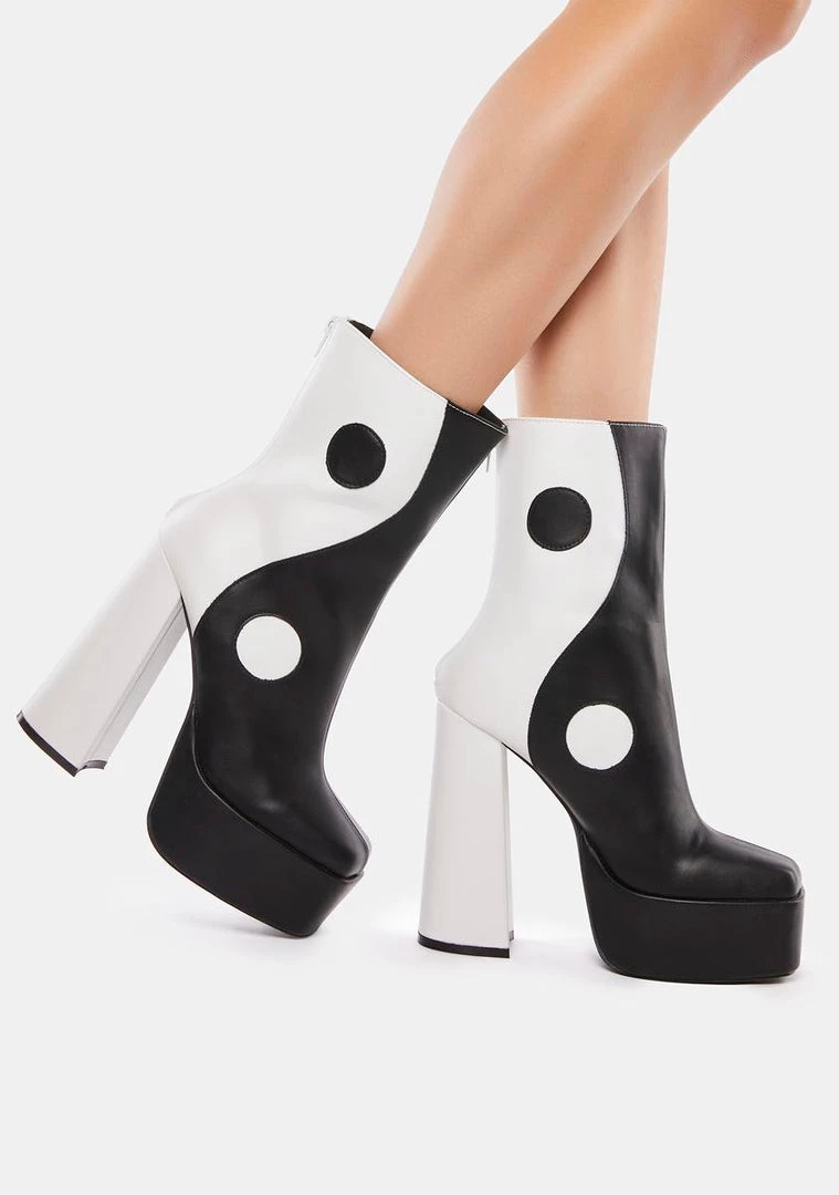 cuz it takes two. These ankle boots come in a vegan leather construction, with a platform heel, square toe, yin yang print, and a back zip closure.