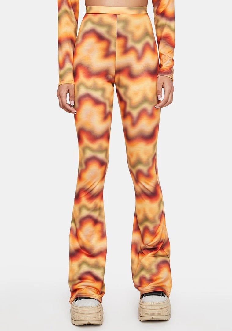 These high-waisted pants feature a vivid psychedelic-inspired print, a slim-fit silhouette with flared legs, and an easy pull-on fit.