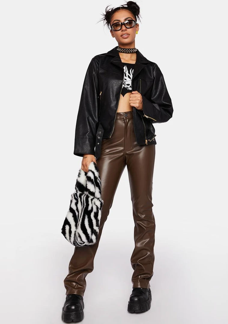 comes in a vegan leather construction, with a collared neckline, zip details, and a waist belt.
