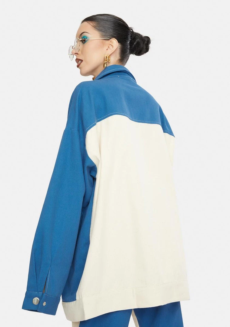 has a denim construction, a half-and-half color block design, an oversized fit, and button up closures.