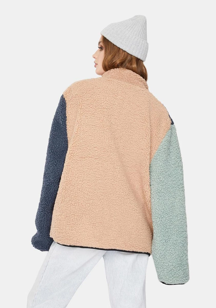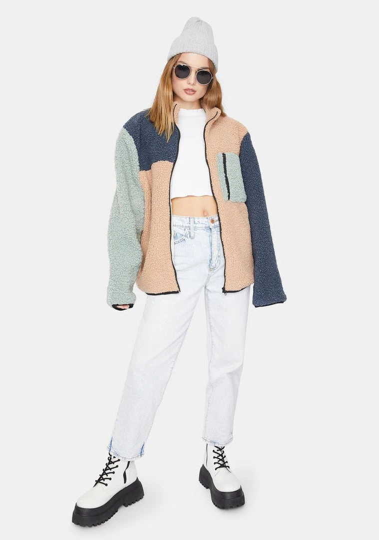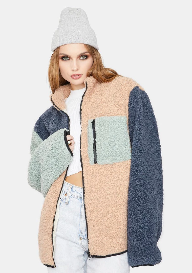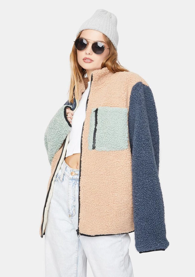 cuz u think outside the box. This sherpa jacket has a pastel colorblock pattern, front chest pocket with zipper closure, collared neckline, and front zip up closure.
