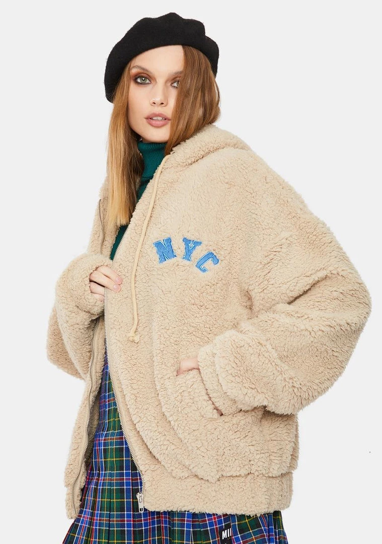 has a sherpa construction, a drawstring hood, a zip up front, and embroidered ‘NYC’ graphic on the left chest.