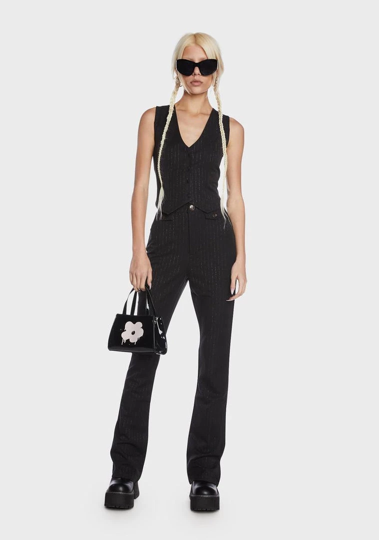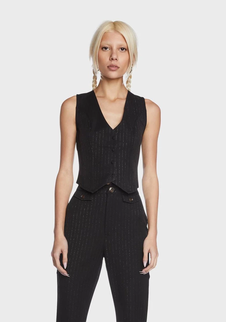 cuz make waves. This fitted vest has a shimmery pinstripe design, a v-neckline, a pointed hem, and front button closures.