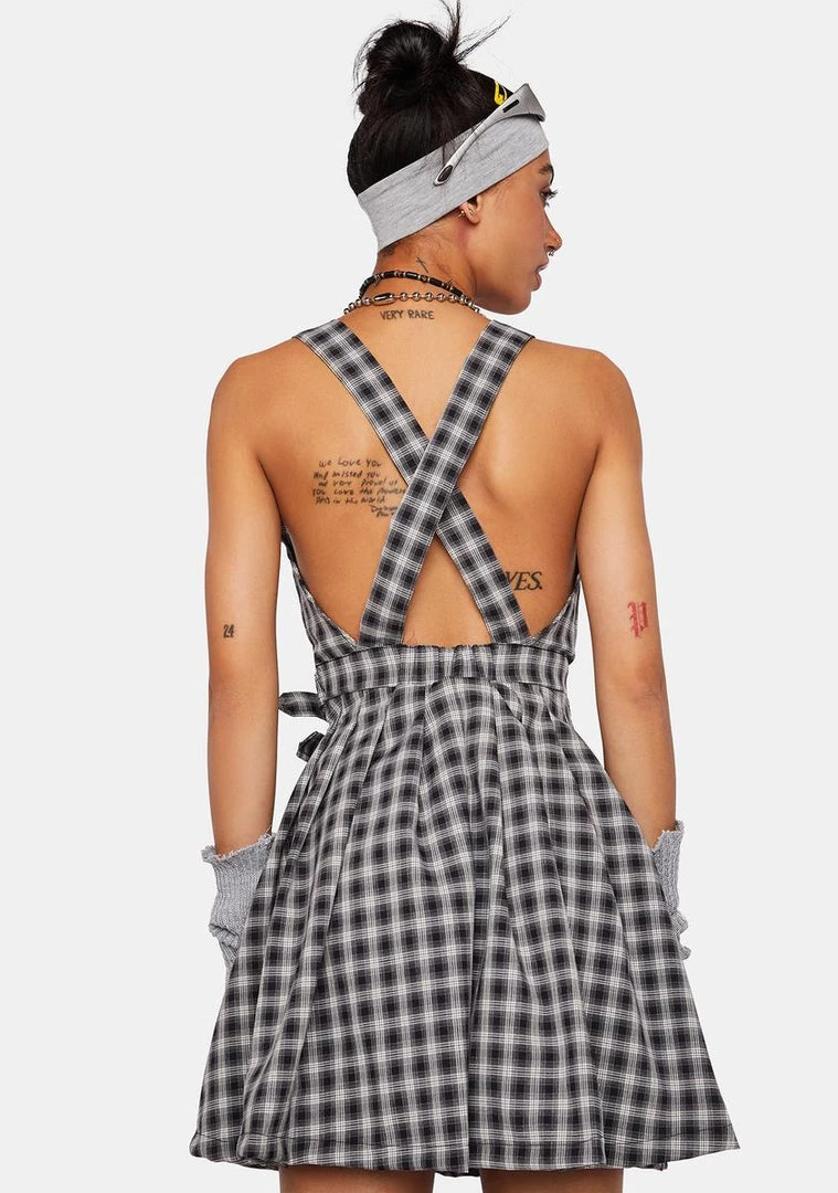 comes with a v neckline, sleeveless fit, belt buckle details, a line skirt, back cross straps, and a plaid print all over.