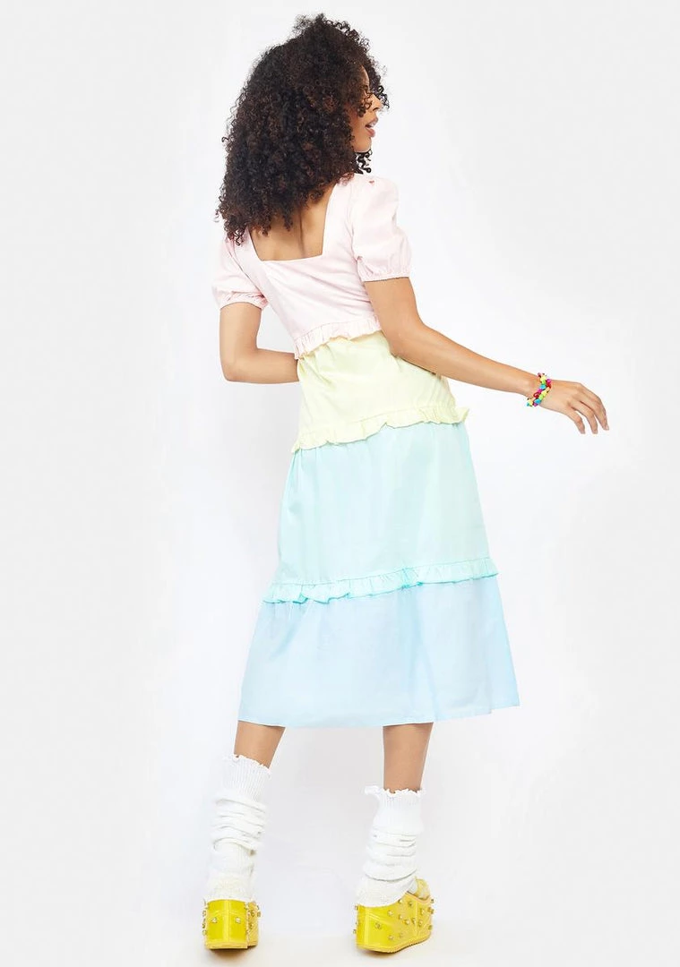 features a fitted bodice with a square neckline, puff sleeves, a tiered skirt with ruffle trim and a rainbow color block design, and a side zipper closure.