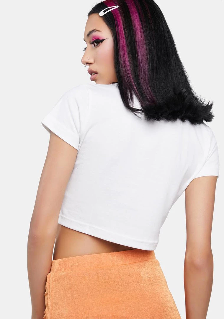 cuz it’s time to spread your wings! This cropped t-shirt has an embroidered butterfly at the chest, a contrast crew neckline, and short sleeves.