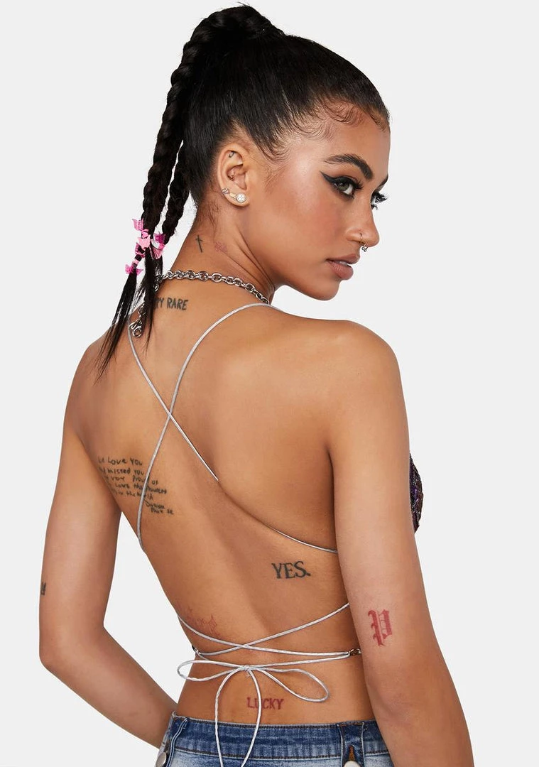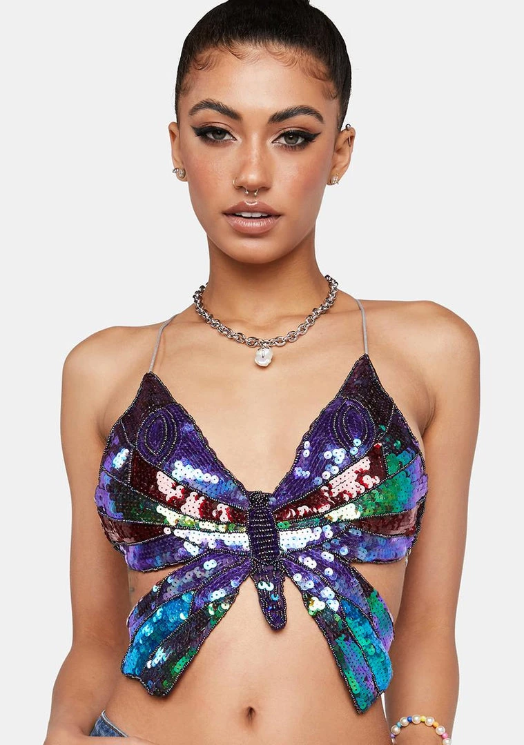 for the y2k vibes! This butterfly-shaped crop top has a colorful sequin construction and strappy adjustable tie closures on the back.