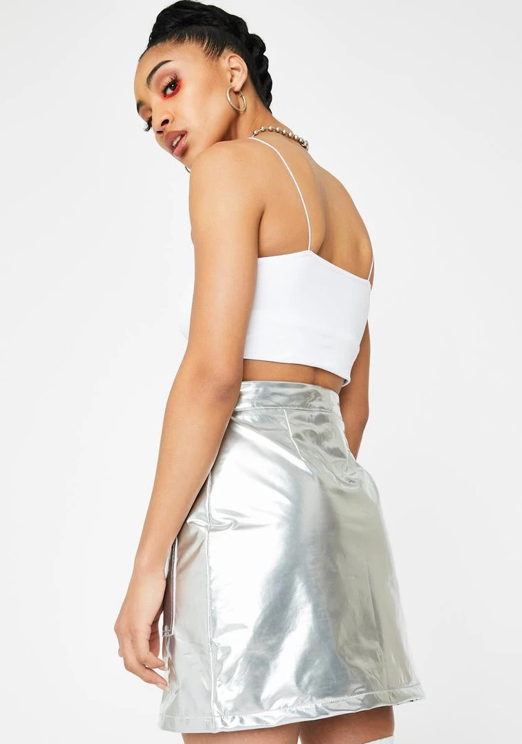 cuz you light up the night! Get outta this world in this groovy mini skirt that has stretchy metallic construction, a high waisted fit, front pockets, and a front zip closure.